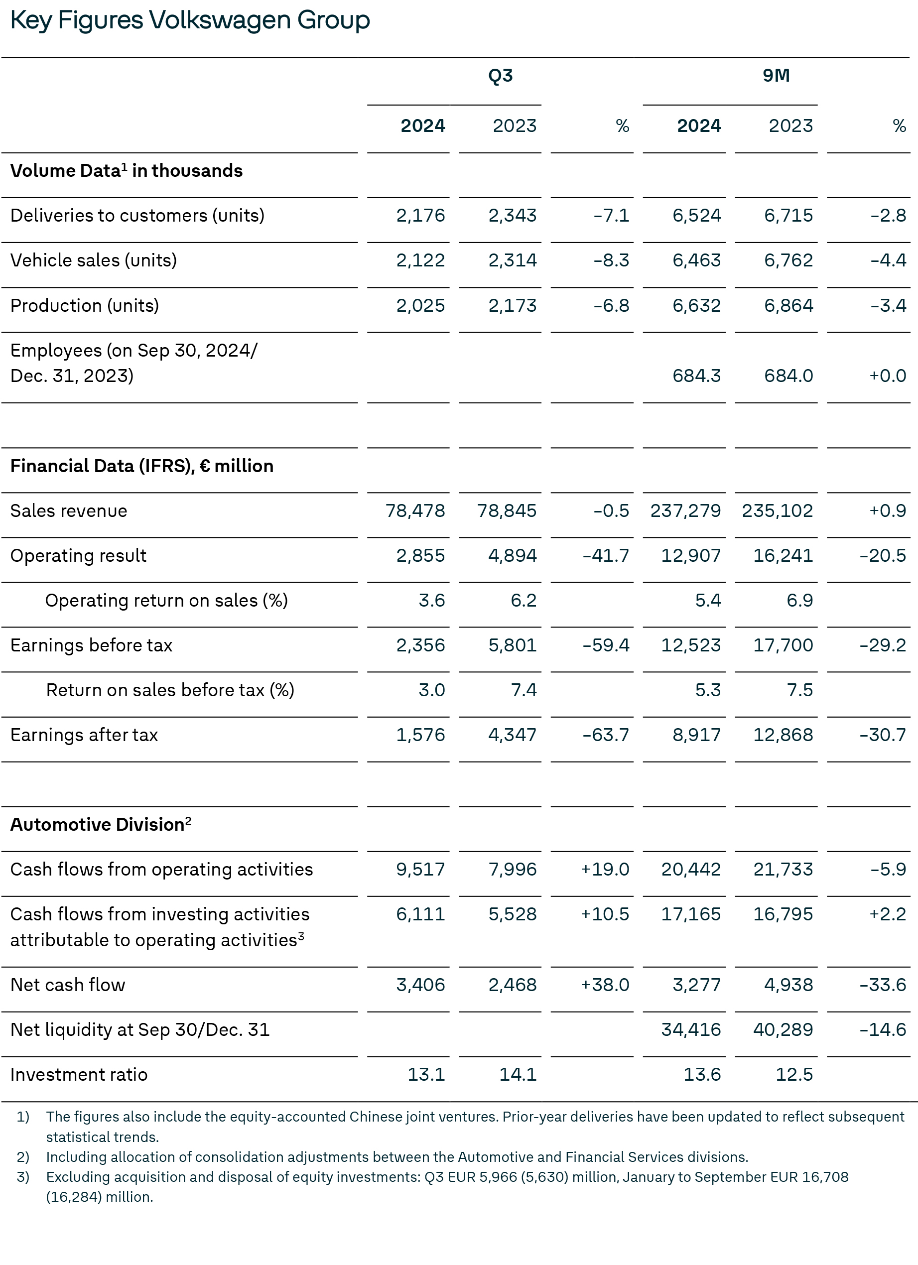 "Vårt niomånadersresultat återspeglar en utmanande marknadsmiljö och understryker vikten av att leverera på de prestationsprogram vi har lanserat i hela koncernen. Volkswagen-märket redovisade en rörelsemarginal på endast två procent efter nio månader. Detta belyser det akuta behovet av betydande kostnadsminskningar och effektivitetsvinster.