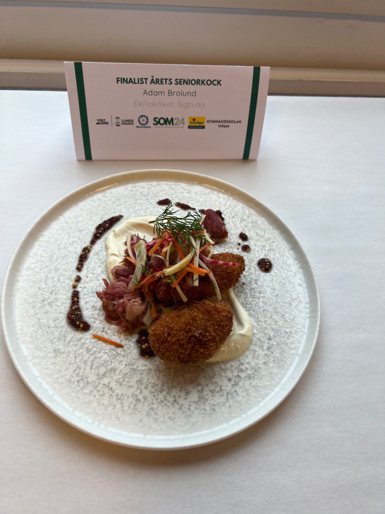 I tisdags tävlade nio kockar från Sveriges alla hörn om att bli årets senior-, förskole- och skolkock. Arrangerade gjorde Sveriges offentliga måltider. Och Adam Brolund kammade hem förstaplatsen i kategorin ”Årets seniorkock” med sin rätt som bestod av fläsklägg, rotmoskroketter, senapscréme, crudité och picklade senapsfrön.