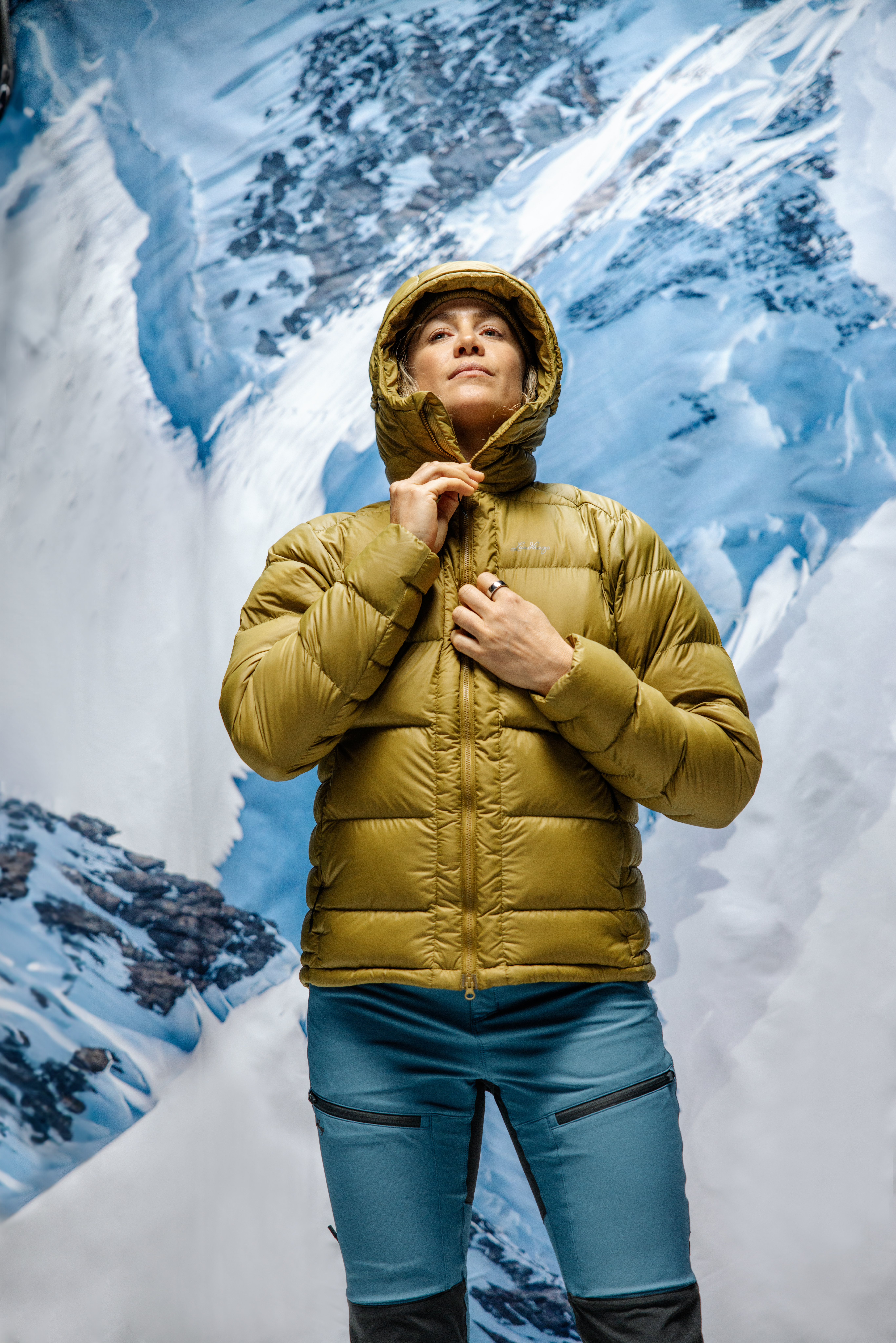 Person iklädd en olivgrön dunjacka står mot en bakgrund av snötäckt berg.