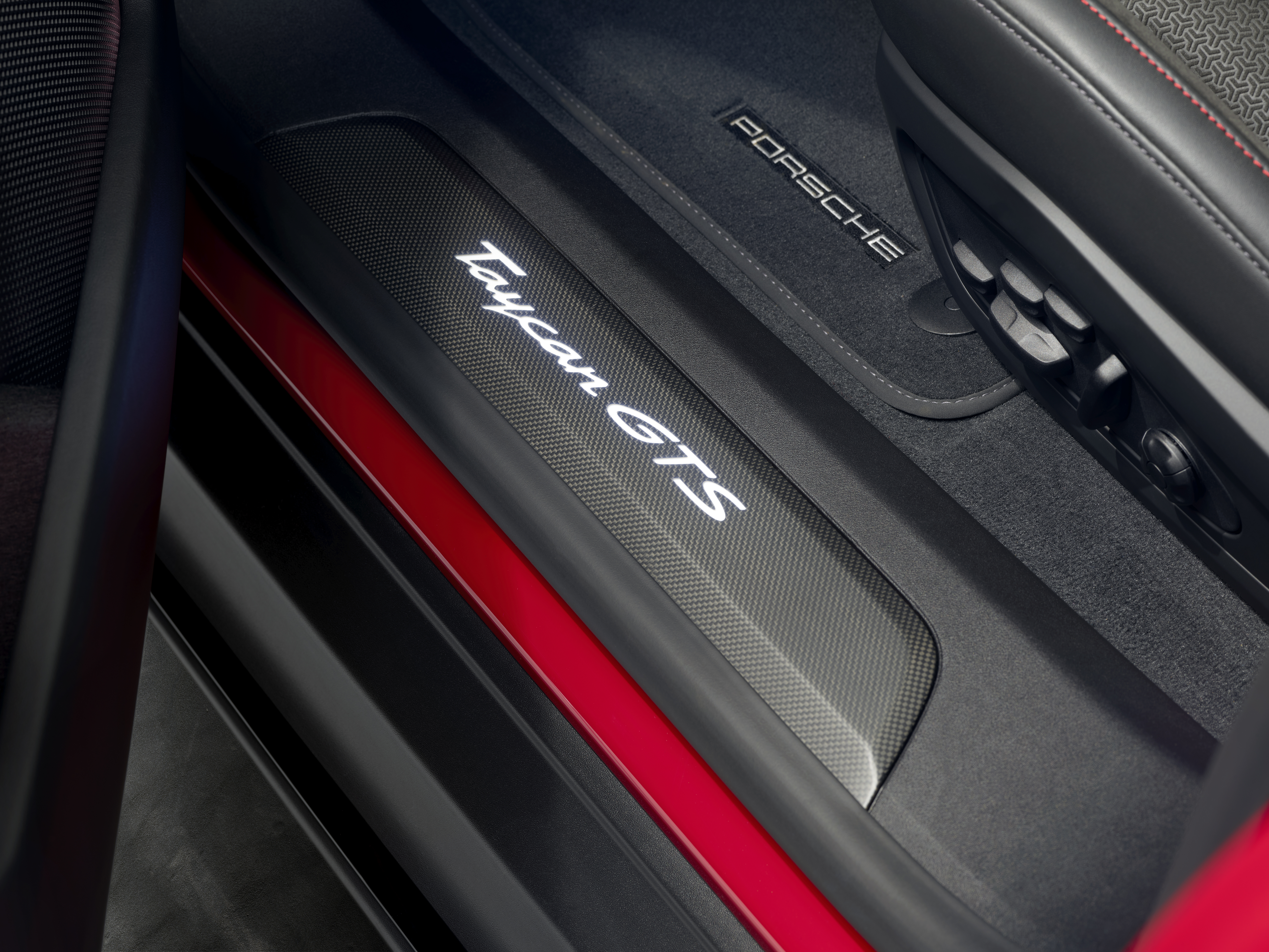 Många av materialen i interiören har hämtats från Taycan Turbo GT-modellerna. Till exempel har Taycan GTS-modellerna som standard utökad omfattning av sportigt Race-Tex i kombination med detaljer i svart läder. Dessutom ingår Adaptiva Sportstolar Plus med elektrisk 18-vägsinställning, GT-multifunktionssportratt med Mode Switch och rattvärme samt Sport Chrono-paket inklusive push-to-pass-funktion och Track Mode. GT-multifunktionssportratt i svart Race-Tex och med samma utformning/funktioner som i Taycan Turbo GT-modellerna finns som tillval, vilket innebär att den levereras med två Mode Switch-omkopplare och paddlar för push-to-pass respektive rekuperation. Nytt är att GTS interiörpaketet även finns i kontrastfärgen Slate Grey Neo, utöver den klassiska GTS-färgen Carmine Red. En Taycan GTS-logotyp pryder kombiinstrumentet, effektmätaren och startgrafiken. BOSE® Surround Sound System är standard.