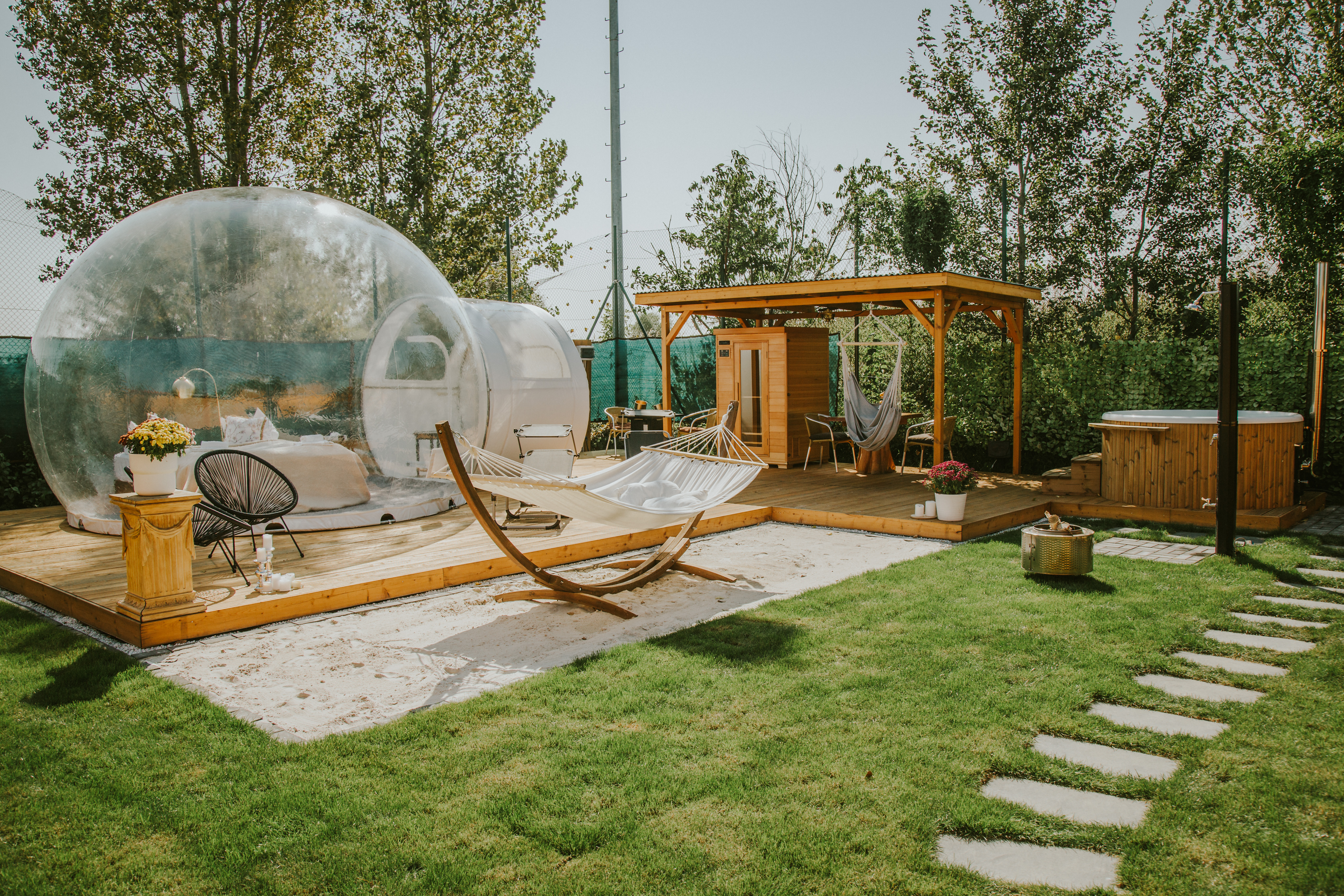 Till tältet hör en vedeldad privat badtunna, en utomhusbastu och en soluppvärmd dusch. En av de vanligaste frågorna från gästerna gäller integriteten i de stora genomskinliga bubblorna.
