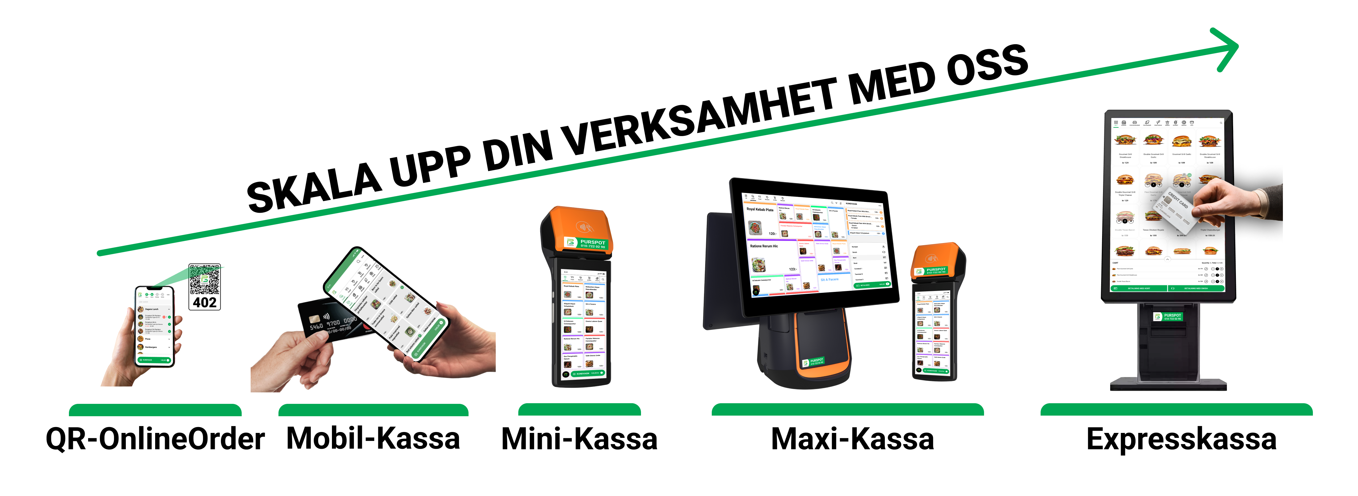 Purspot erbjuder ett brett utbud av kassasystem och betallösningar för restauranger och yrkespersoner. Produkterna omfattar allt från kassasystem i mobilen för betalningar på språng, till Expresskassa som möjliggör snabb och självbetjänad betalning utan köer.