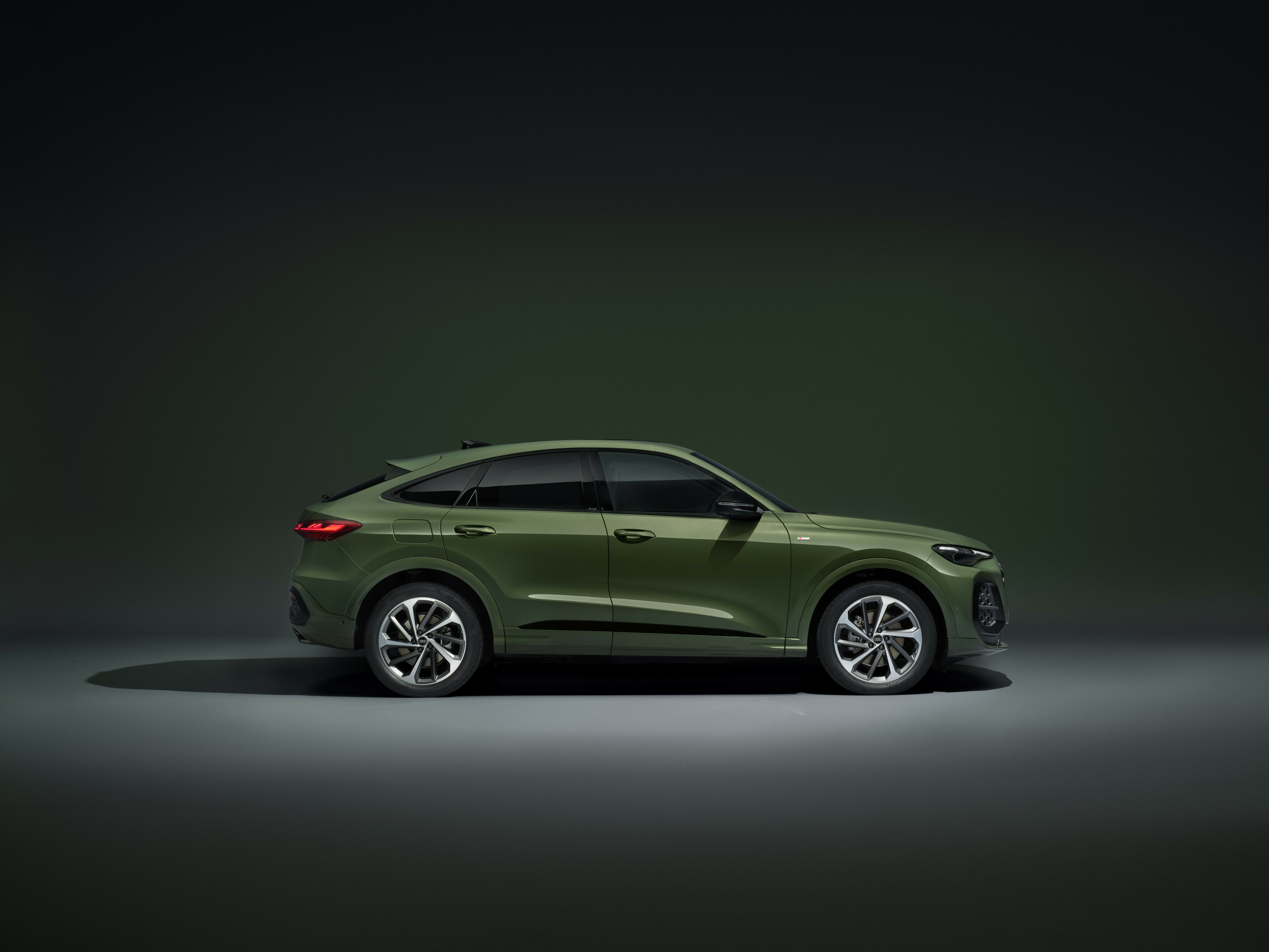 Q5 Sportback är redan från standard utrustad med den sportiga i S line-versionen i Sverige, liksom praktiskt takreling. Typiska kännetecken är Singleframe-grillen som omges av en ram i kromoptik matt antracit och fönsterlister i aluminiumoptik, liksom större luftintag och markerad diffusor. Andra generationens digitala OLED-baklyktor och det nya projektionsljuset i spoilern ovanför bakrutan ökar säkerheten. Det senare projicerar en grafik upptill på bakrutan som gör bromsljusområdet större. 19-tums lättmetallfälgar ingår som standard.
