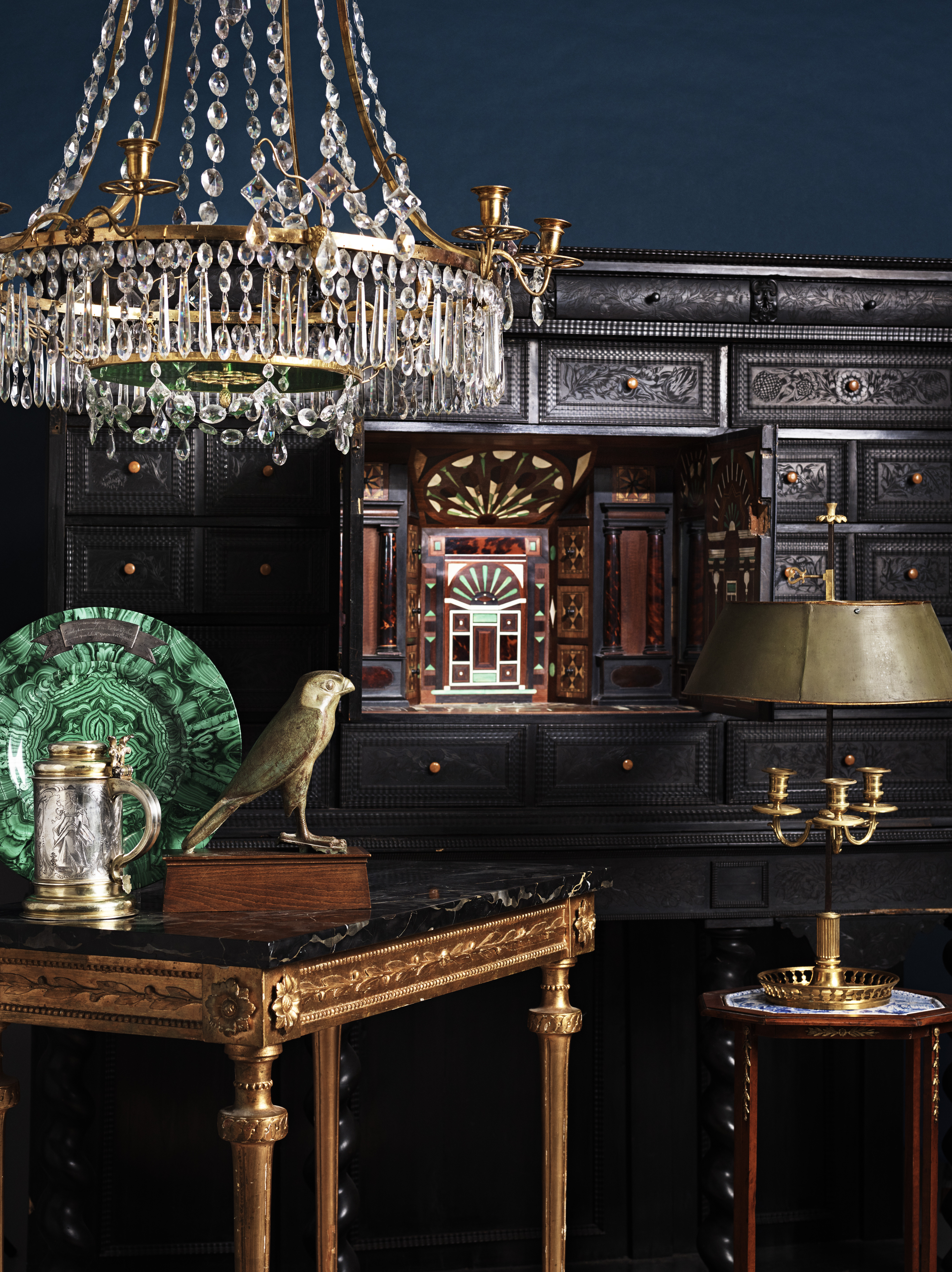 Möbler och konsthantverk bjuder på en spännande avdelning med mästerverk, från tidiga medelhavskulturer till den svenska guldåldern på sent 1700-tal. Bland höjdpunkterna finns föremål ur de världsberömda samlingarna av Emil Hultmark och Carl Kempe, med både en Horusfalk och en omfattande samling guldföremål. Här finns också flera verk av Georg Haupt och Gottlieb Iwersson, samt ett exklusivt och ovanligt skåp från 1600-talets Paris och Solkungen Ludvig XIV:s tid. På silveravdelningen utmärker sig "Sparreska terrinen" av Simson Ryberg, en dubbelpipig tekanna skapad av Bengt Hafrin, samt en utsökt spegel och en gulddosa av Christian Precht.