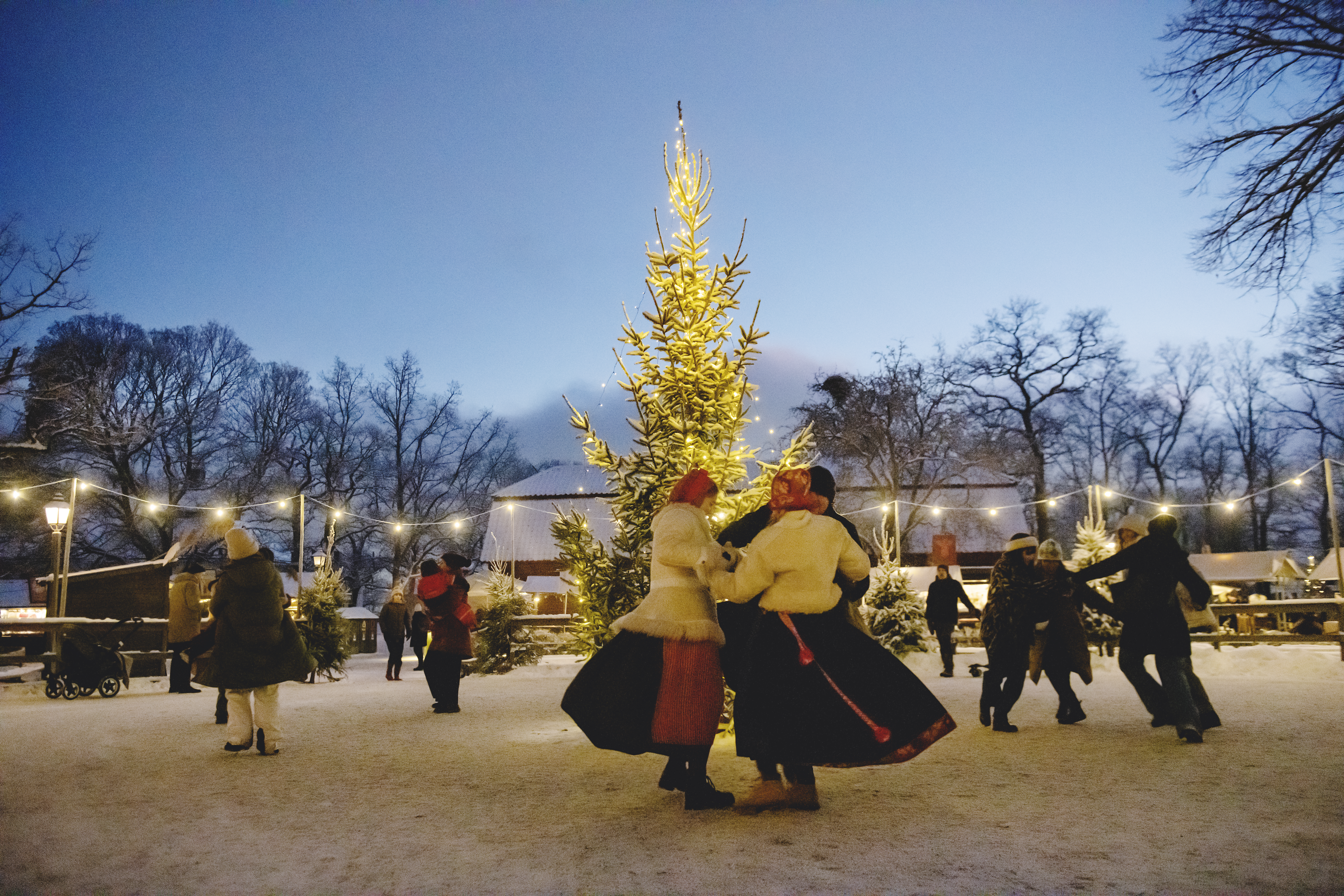 Skansens julmarknad, med anor från 1903, äger rum varje fredag till söndag mellan den 29 november och 22 december. Här kan gästerna köpa allt från hemslöjd och design till godis och hemliga julklappar samt delta i dans runt granen.
