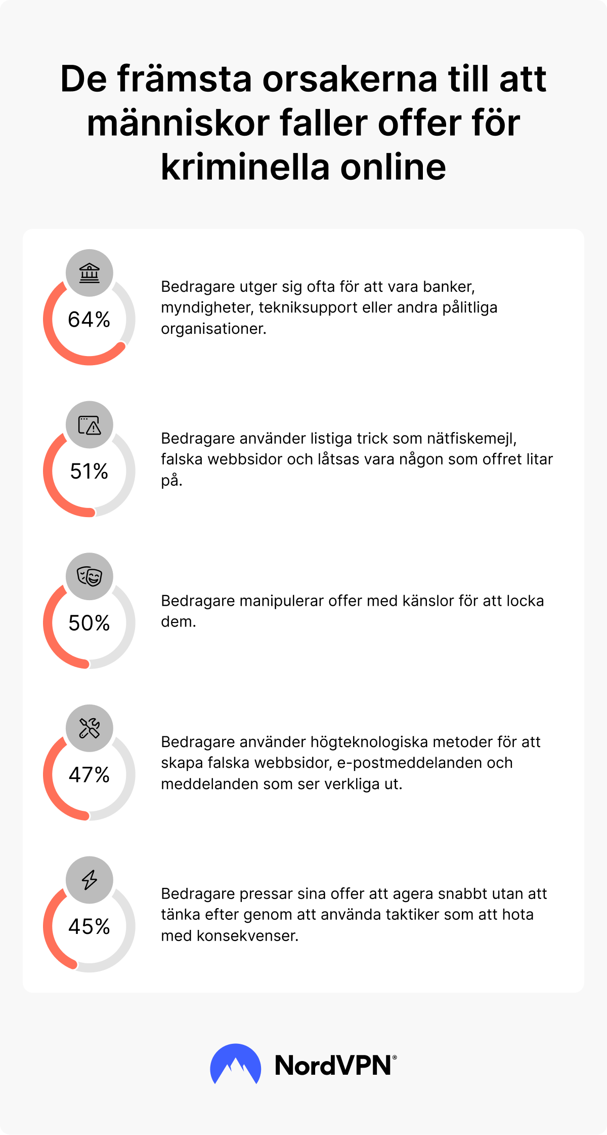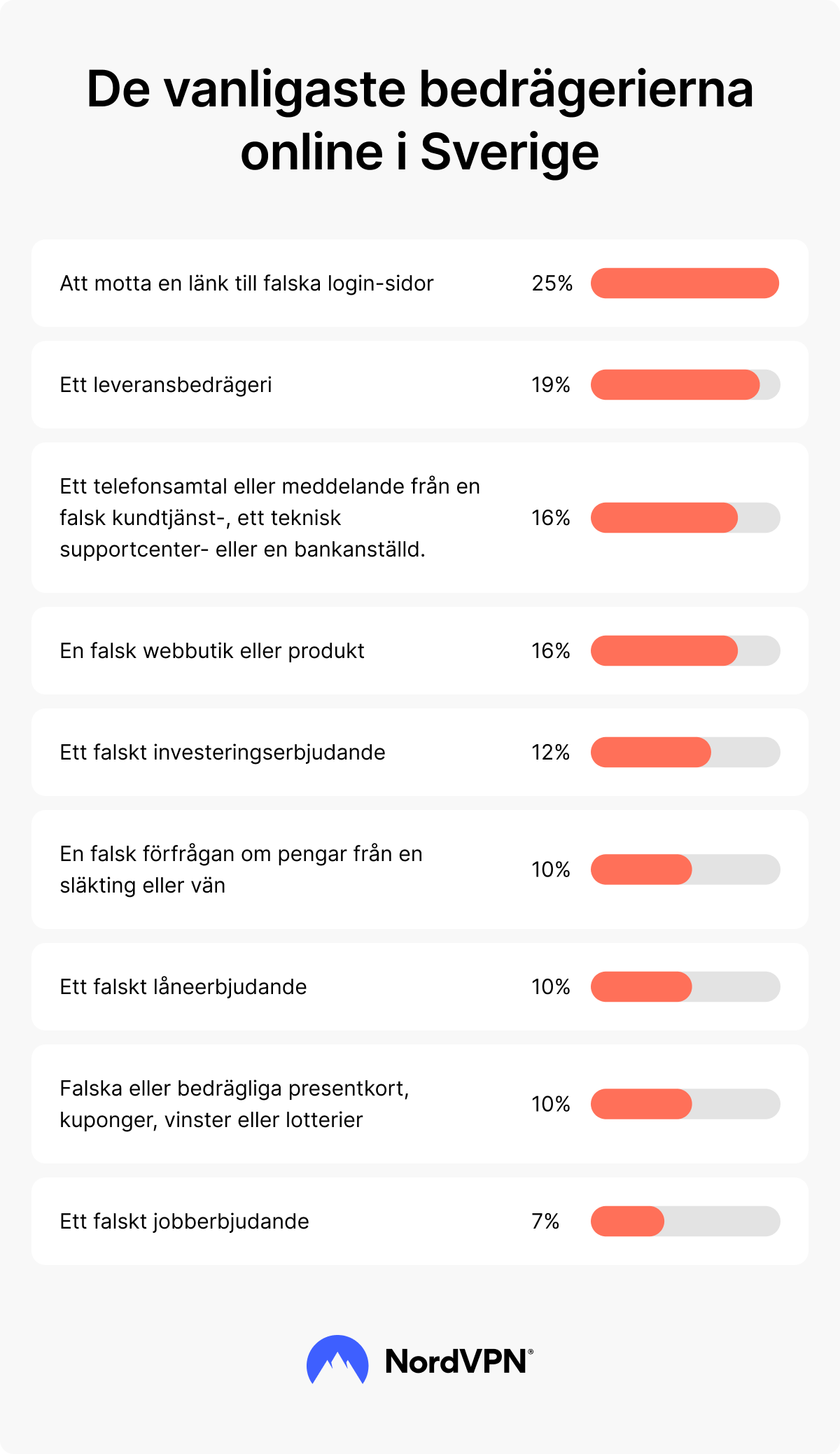 En undersökning som utförts av Cint, på uppdrag av NordVPN, visar att närmare två tredjedelar (64%) av alla svenskar de senaste två åren råkat ut för någon form av cyberbrott. Den vanligaste typen av brott är bedrägerier kopplade till internetshopping, såsom falska inloggningssidor (34%) och uteblivna leveranser av beställda produkter (29%) från en oärlig aktör eller fejkad webbutik.