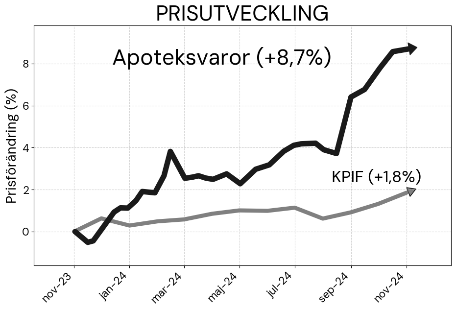 Från november 2023 till november 2024 steg priserna på receptfria läkemedel med 5,2 procent och övriga apoteksvaror med 6,8 procent, medan den allmänna inflationstakten enligt KPIF var 1,8 procent. Prisökningarna på läkemedel var därmed tre gånger högre än den genomsnittliga prisutvecklingen i samhället.
