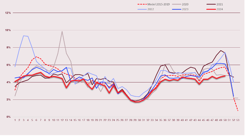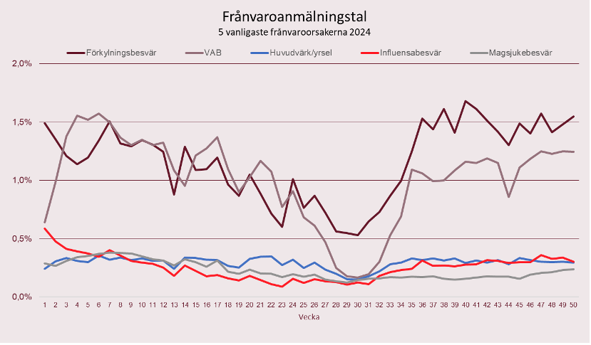 Hela 2024 har präglats av relativt låga sjuktal, med vissa stunder av höga sjuktal inom särskilda orsaksområden. Under hösten är det framförallt förkylningar som härjat på svenska arbetsplatser, vilket även orsakat relativt mycket VAB. I början av december syns även tendenser att vinterkräksjukan är här, med viss ökning av sjukskrivningar på grund av magsjukebesvär.