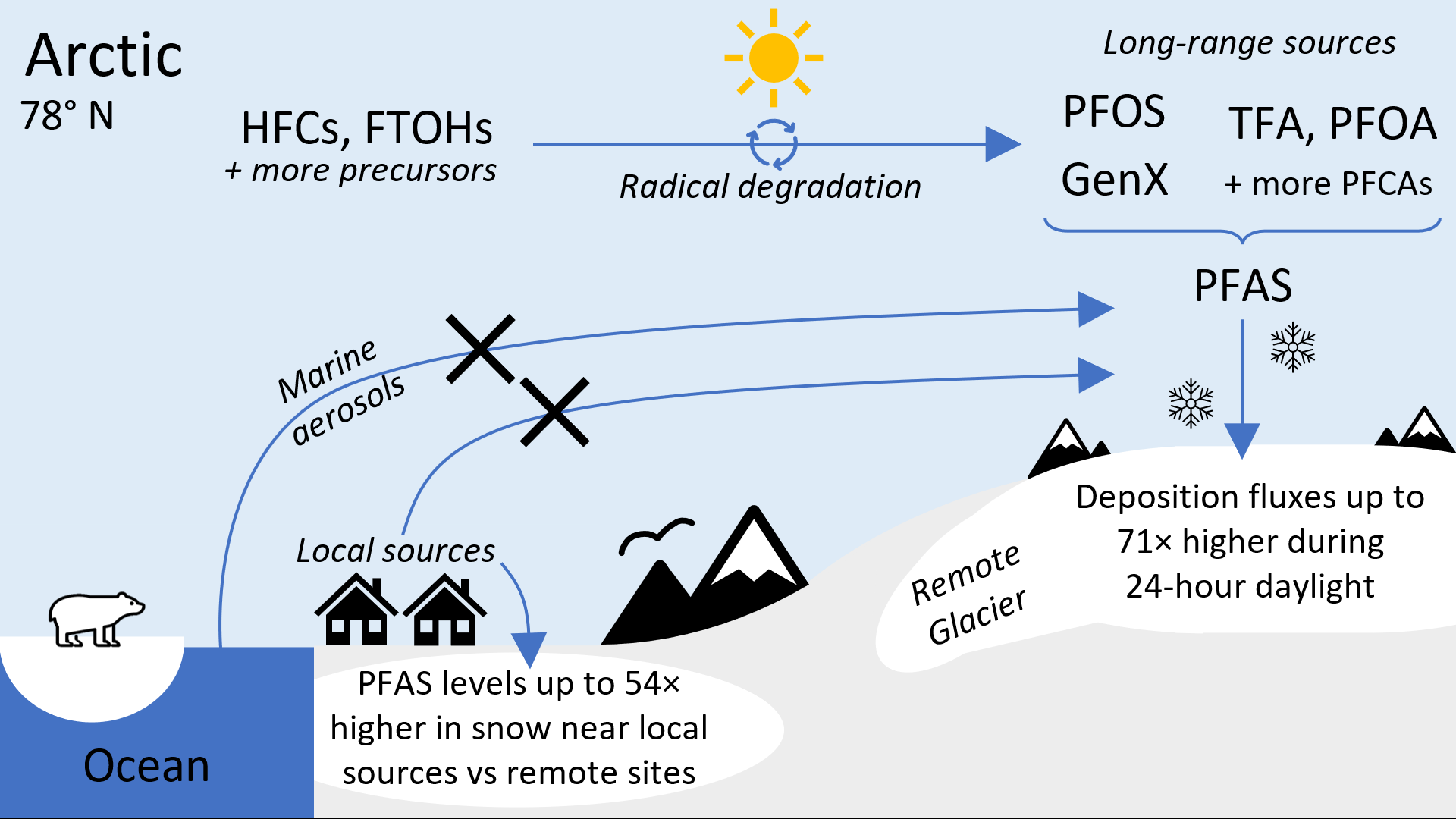 Solens ljus startar fotokemiska reaktioner som gör att PFAS i atmosfären omvandlas till andra sorters PFAS som kan föras till jorden vid nederbörd. PFAS-ämnena i atmosfären kommer i första hand från fabriker och avfallshantering, och de kan färdas tusentals mil innan de regnar eller snöar ner på jorden.