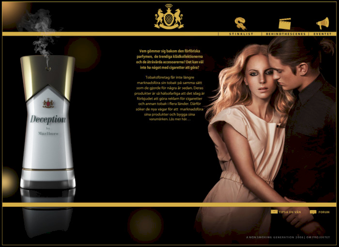 Liksom tobaksindustrin har organisationen använt sig av kommunikationsexperter för att lansera den fiktiva parfymen Deception by Marlboro.