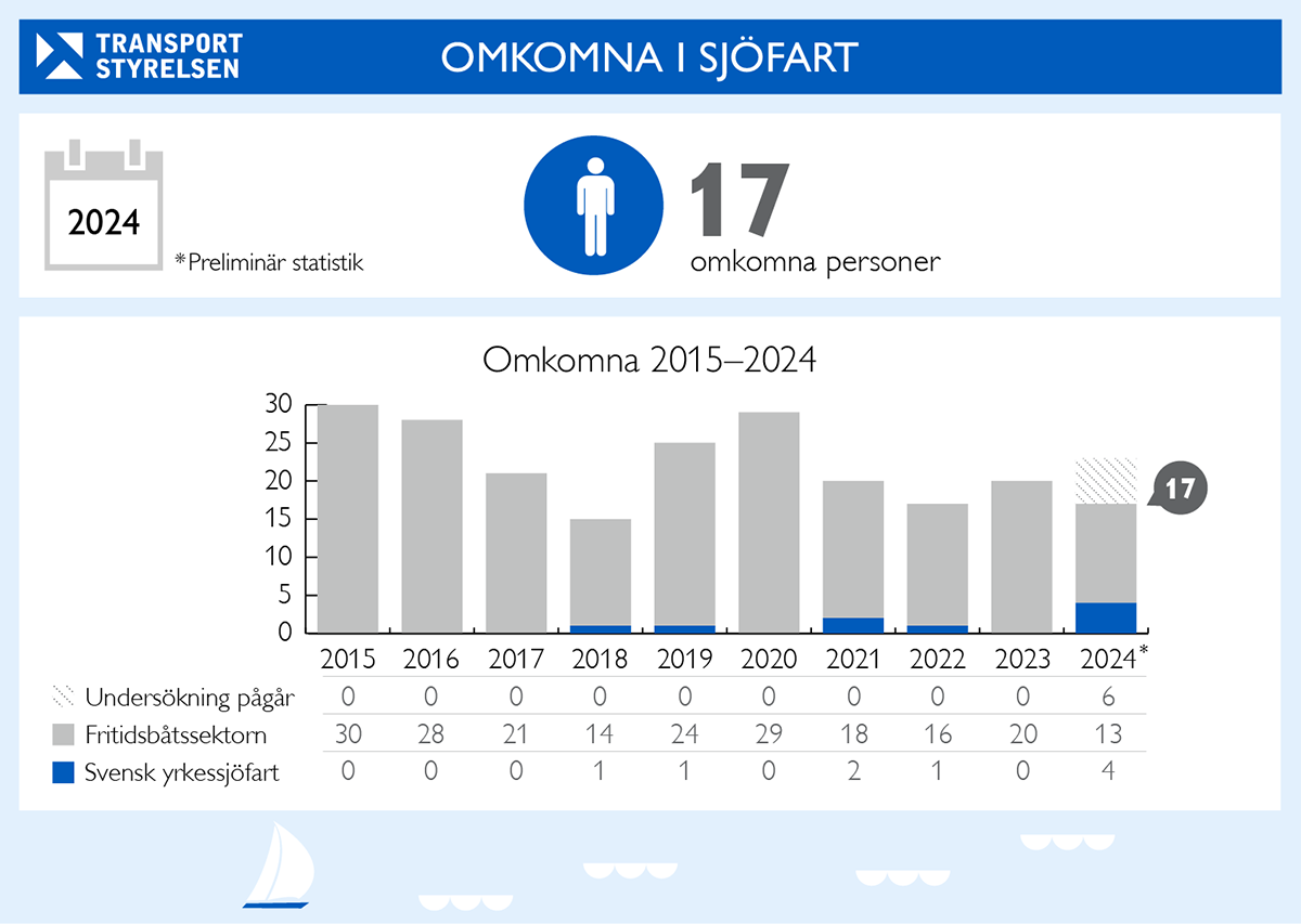 Det inträffade 17 olycksfall med dödlig utgång inom den svenska sjöfarten och båtlivet 2024. Av dem skedde fyra inom yrkessjöfarten, vilket är den högsta siffran på över 15 år. Det visar Transportstyrelsens preliminära olycksstatistik.