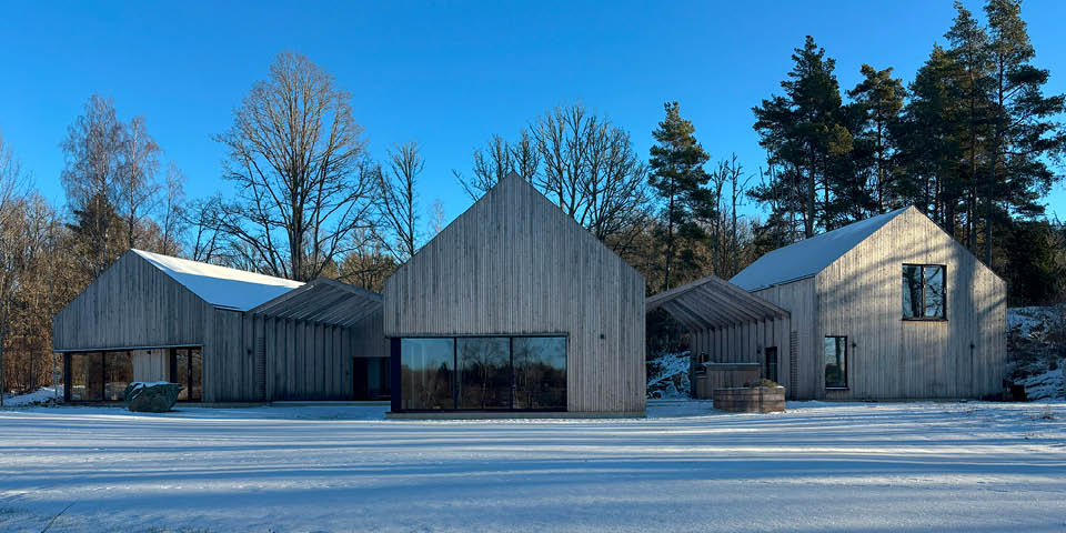 Husen bidrar till platsen genom sin placering, tredelning av volymerna och dynamiska öppningar mellan skog och sjö.”