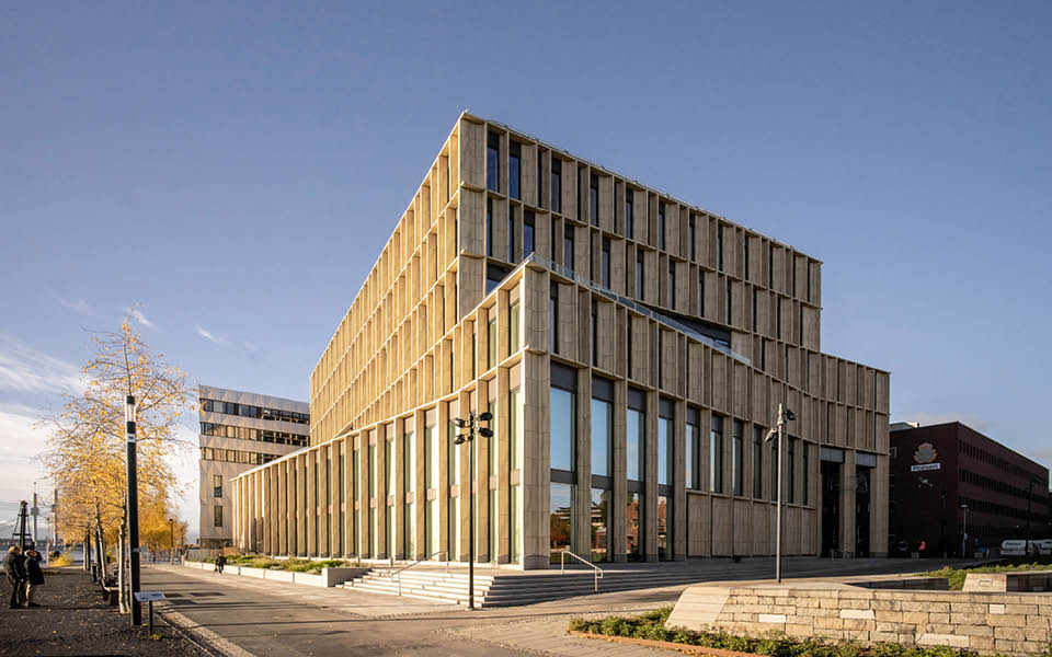 Domstolsbyggnadens fasad är skickligt gestaltad och uppbyggd av djupa, mjuka pelarmoduler som skapar ett rikt skuggspel och den bidrar till platsen med inbjudande sittnischer.