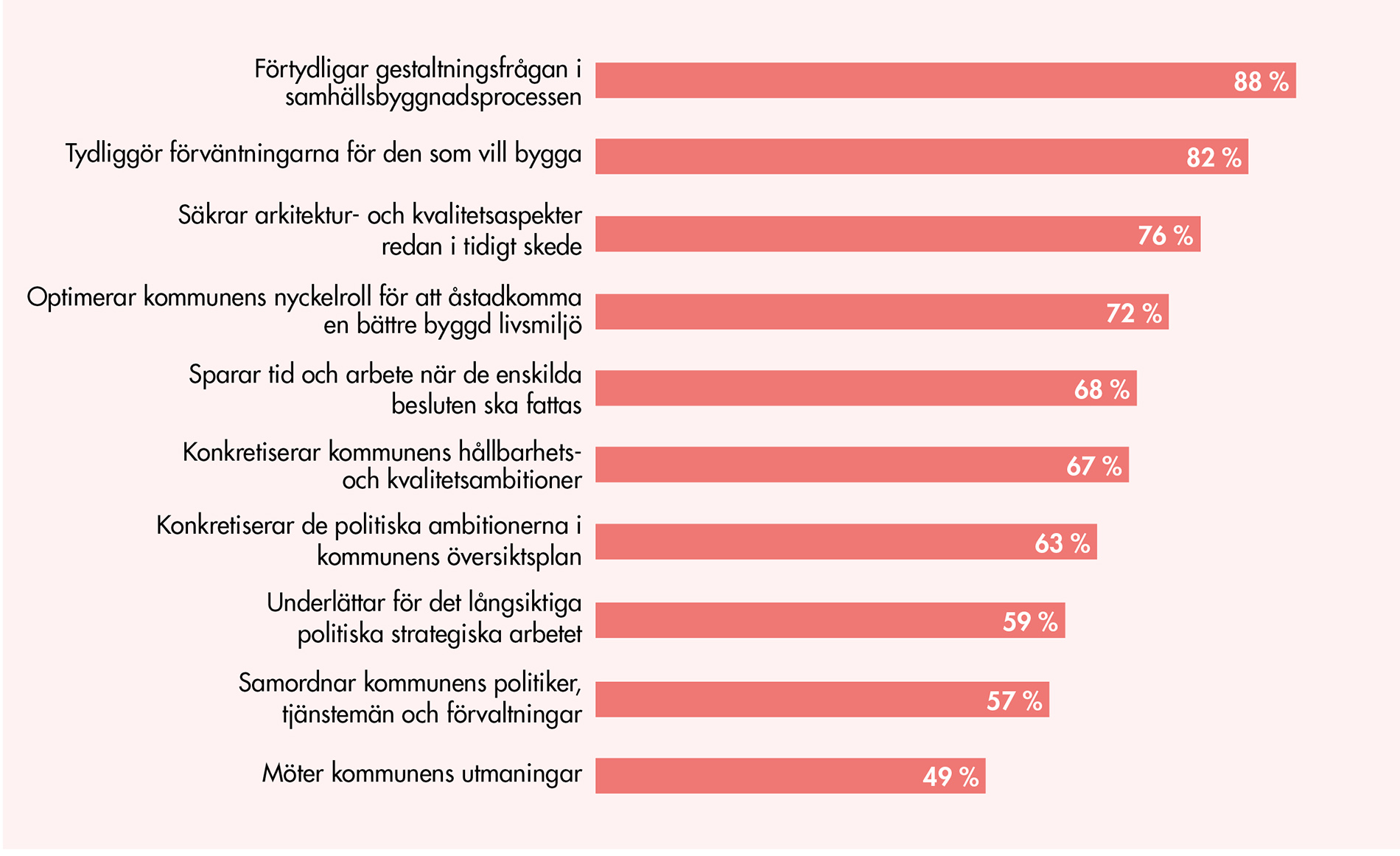 - förtydligar gestaltningsfrågan i samhällsbyggnadsprocessen (88 %),