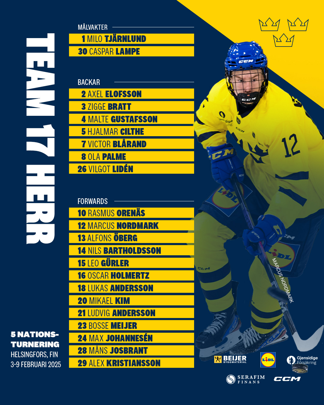 Johan Rosén, förbundskapten för Team 17 Herr, har tagit ut truppen som ska spela 5-nationsturneringen i Helsingfors, Finland 3-9 februari 2025.