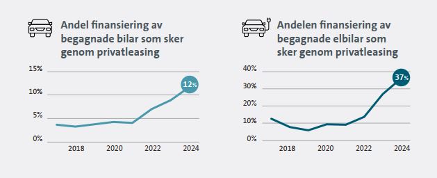 Antalet nya privatleasade bilar i Sverige steg med 25 procent under 2025 jämfört med 2024. Tillväxten för privatleasing var kraftig med tanke på att hela bilmarknaden i Sverige utvecklades svagt 2025 med en tillväxt på enbart 1,3 procent. Andelen laddbart var 59% av nya bilar på privatmarknaden för bilfinansiering, vilket är en rekordhög nivå för husållen. Även företagen är på sin högsta andel laddbarat och står för 90 procent av de företagsleasade nya personbilarna.