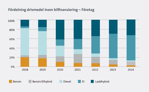 - Även när företag väljer bil är leasing fortsatt helt dominerande. Företagen väljer främst laddbara bilar. Mindre än 15 procent av företagens bilfinansierade fordon är inte laddbara. Offentlig sektor går i en annan riktning med ökad andel fossildrivna bilar