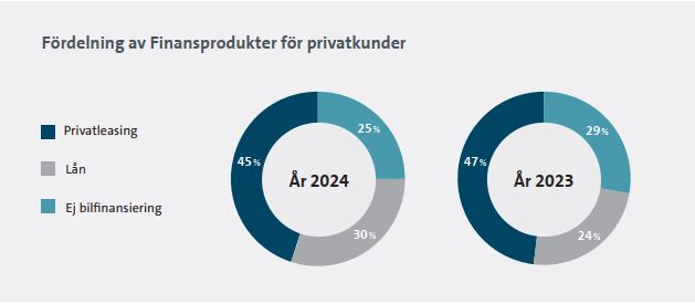 Under 2024 valde 45 procent av hushållen som skaffade en ny bil att finansiera den genom privatleasing. 30 procent valde billån, det vill säga ett lån med bilen som säkerhet. 25 procent av bilköparna finansierade bilen på annat sätt, exempelvis med sparade pengar eller lån med annan säkerhet än bilen.