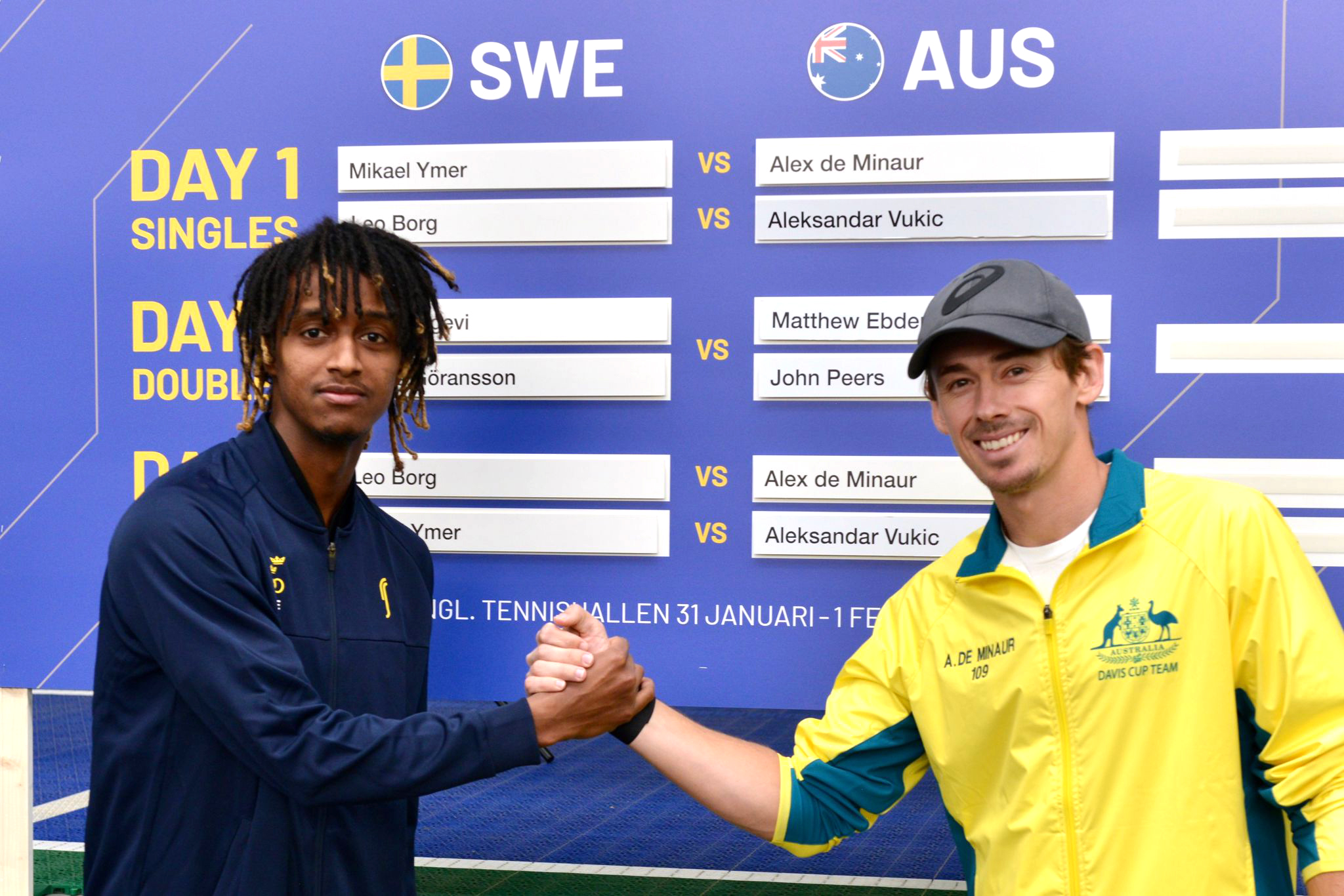 Comebackande Mikael Ymer inleder landskampen mot världsåttan Alex de Minaur. I fredagens andra singelmatch ställs Leo Borg mot Aleksandar Vukic, rankad 66.