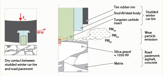 In the EU, non-exhaust vehicle emissions from tire, road and brake wear are equivalent to exhaust emissions in terms of PM10 (particles with aerodynamic diameters smaller than 10 µm), Olofsson says. But in the Nordic countries, non-exhaust PM10 emissions significantly exceed those from exhaust due to the frequent use of studded tires.