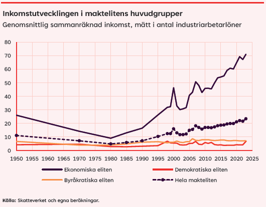 Rapporten, Makteliten – i raketfart från verkligheten visar att den ekonomiska eliten, som utgörs av vd:arna för 50 svenska storföretag, snabbt ökar sina inkomster. Rapporten, med data sedan 1950 visar bland annat att ökningen sen innan pandemin är kraftig. 2019 var den genomsnittliga inkomsten i den ekonomiska eliten 60 gånger en industriarbetarlön, 2023 hela 71 gånger.