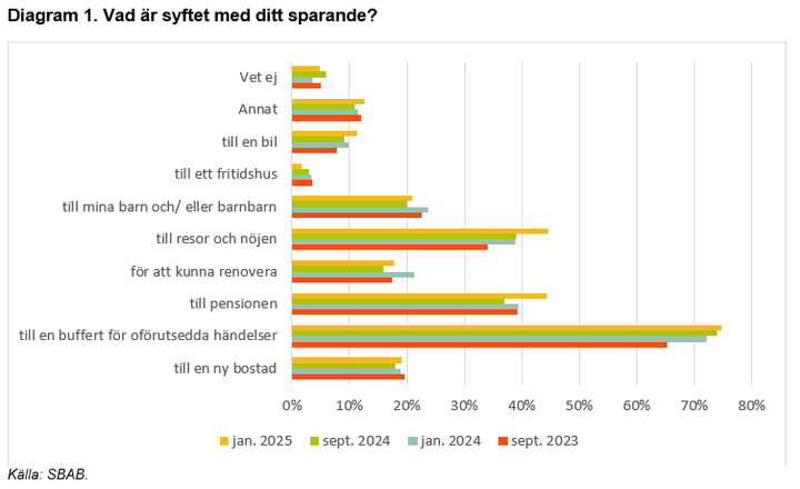 Att buffertspara är, i likhet med tidigare mätningar, det i särklass mest populära motivet till att spara. Cirka 75 procent uppger att de sparar för oförutsedda händelser. Undersökningen visar dock att sparandet i övrigt förändrats. Nu prioriterar till exempel fler att spara till en ny bil, resor och nöjen (se diagram 1).