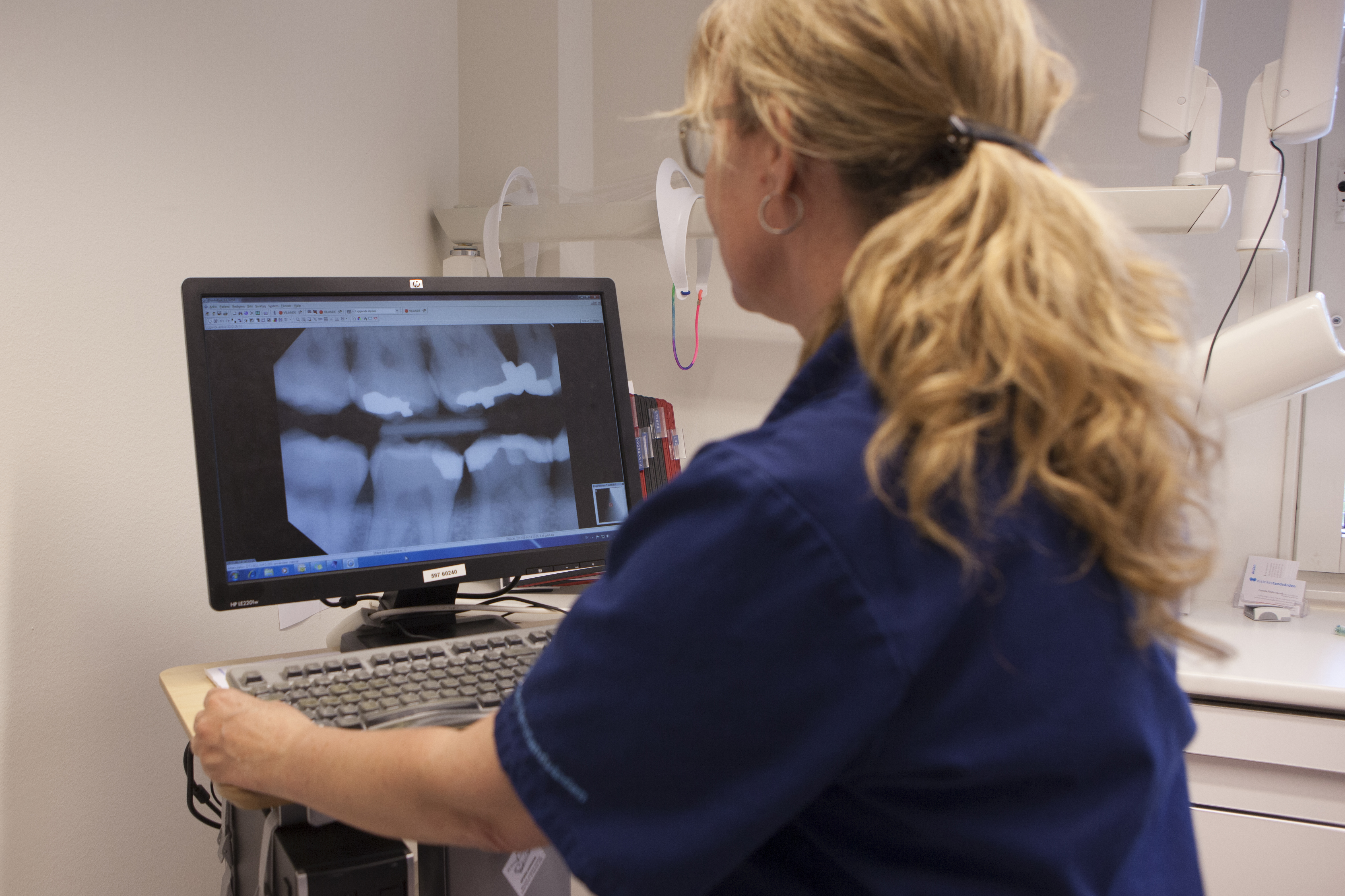 Tandläkare granskar en röntgenbild på en skärm