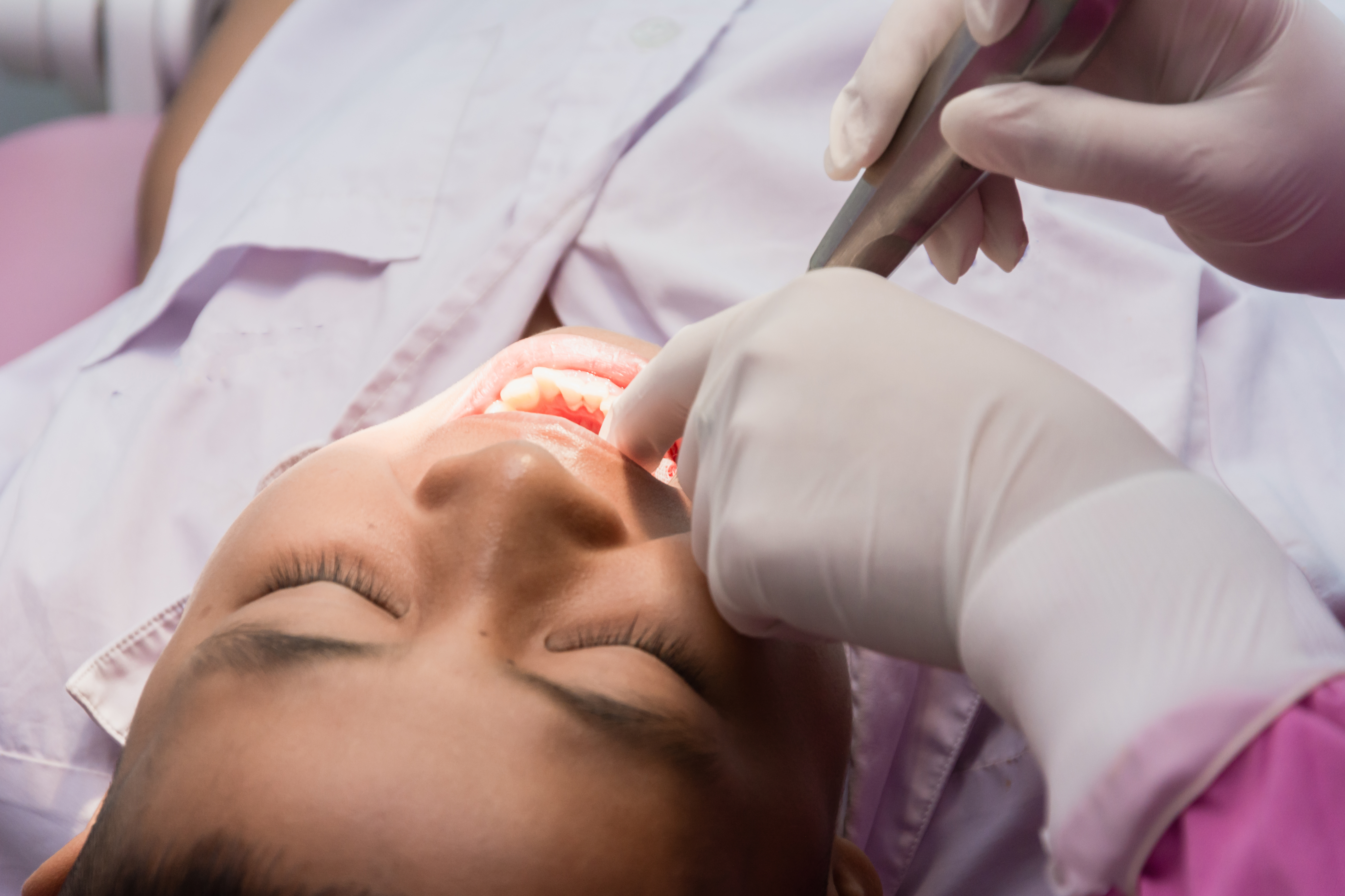 Patient ligger i tandläkarstol och blir undersökt av tandläkare