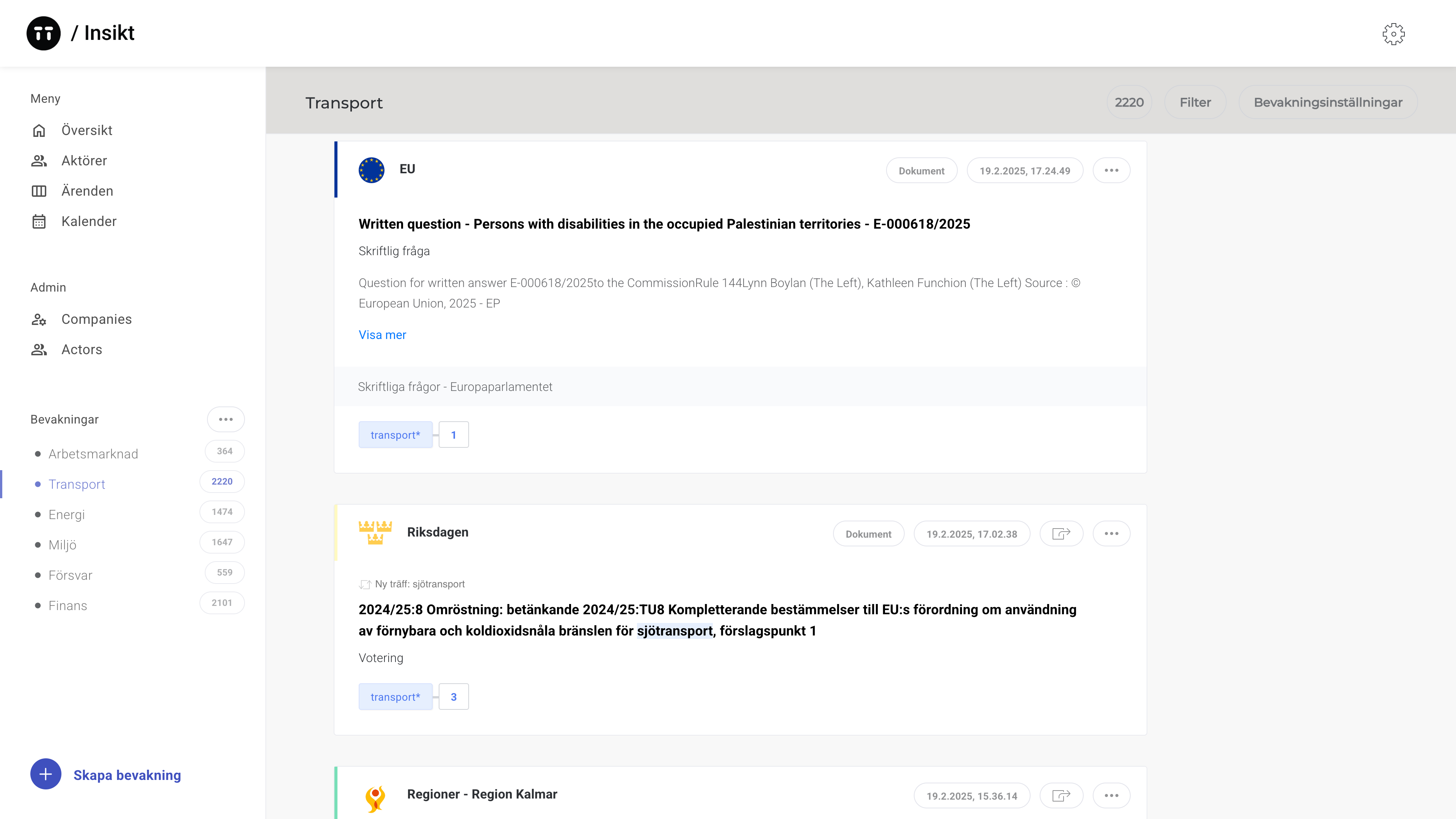En remiss från ett departement, ett betänkande från riksdagen, en rättsakt från EU eller en nyhet från en länsstyrelse. Flödet av samhällsinformation är enormt. Den nya tjänsten hjälper användarna att följa den politiska utvecklingen inom deras valda intresseområden.