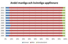 *Könstillhörighet i statistiken bestäms av uppfinnarens förnamn. Kategorin ”könsobestämt” har legat på omkring fem procent sedan 2005 för patentansökningar.
