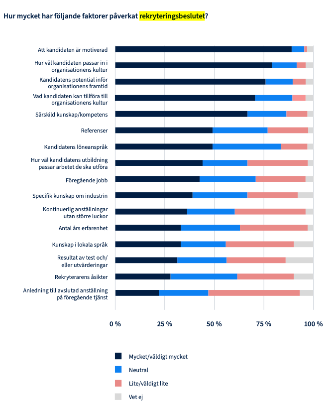 Enligt Jobblands nationella rekryteringsundersökning* är de fyra viktigaste faktorerna alla så kallade “mjuka värden”: kandidatens motivation, hur väl hen passar in i organisationen, kandidatens potential och vad kandidaten kan tillföra till organisationens kultur. Först därefter kommer mer hårda värden som särskild kompetens, referenser och löneanspråk.