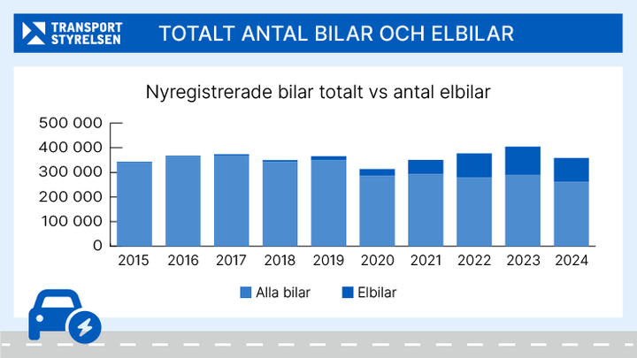 – Antalet nyregistrerade personbilar sjönk tydligt under 2024. Den mest tydliga nedgången syns blandde rena elbilarna som minskade från 113 571 till 97 079. Det motsvarar en minskning på mer än 14 procent, säger Mikael Andersson, presschef på Transportstyrelsen.