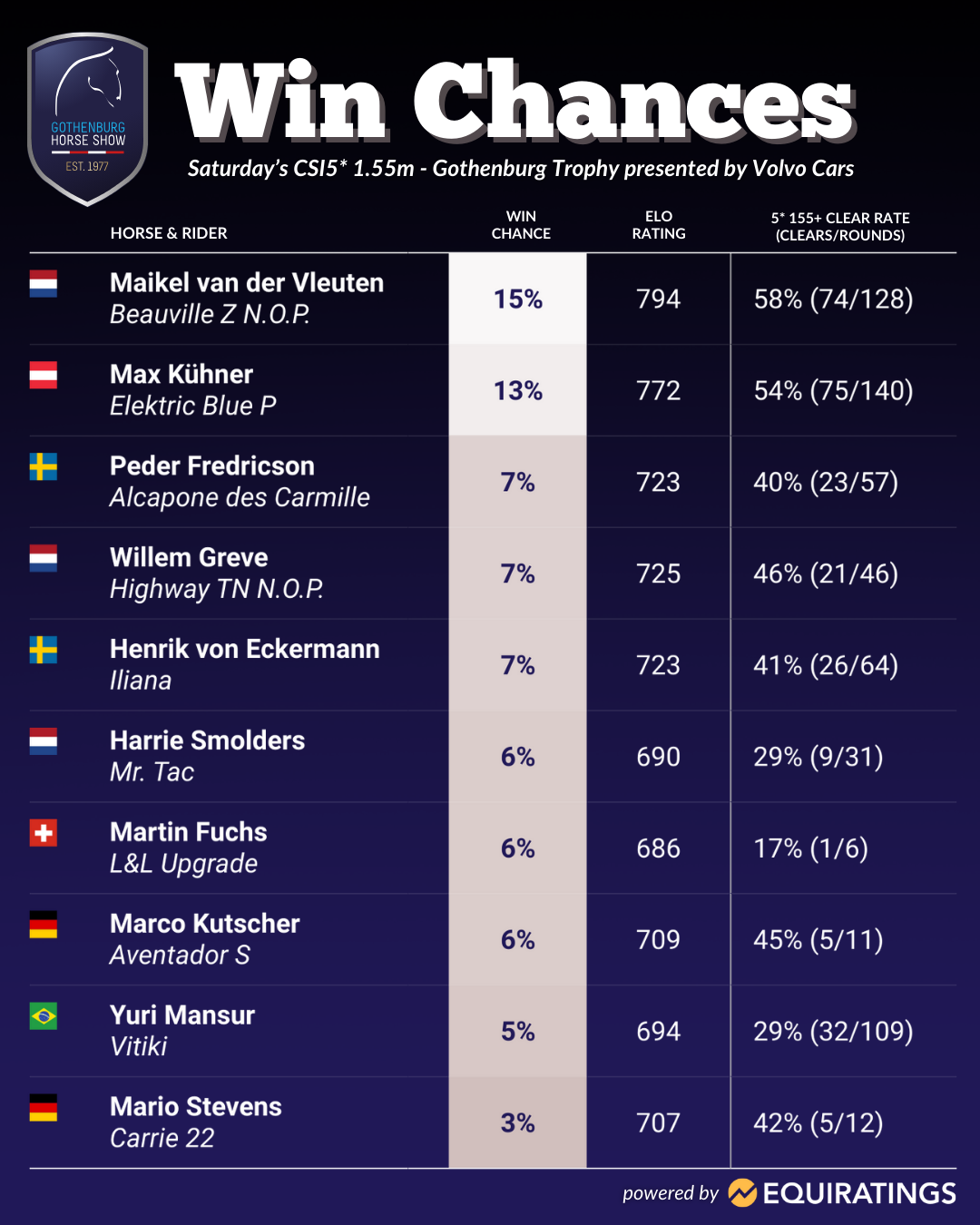 Van der Vleuten och Beauville Z N.O.P. går in i klassen som favoriter och har en av de högsta Elo-rankningarna i historien. Under de senaste 12 månaderna har de hållit en exceptionell felfrihetsprocent på 65% på denna nivå – en statistik som endast ett fåtal hästar i världen kan matcha. Deras stabilitet och beprövade förmåga att rida felfritt gör dem till toppkandidater för segern.