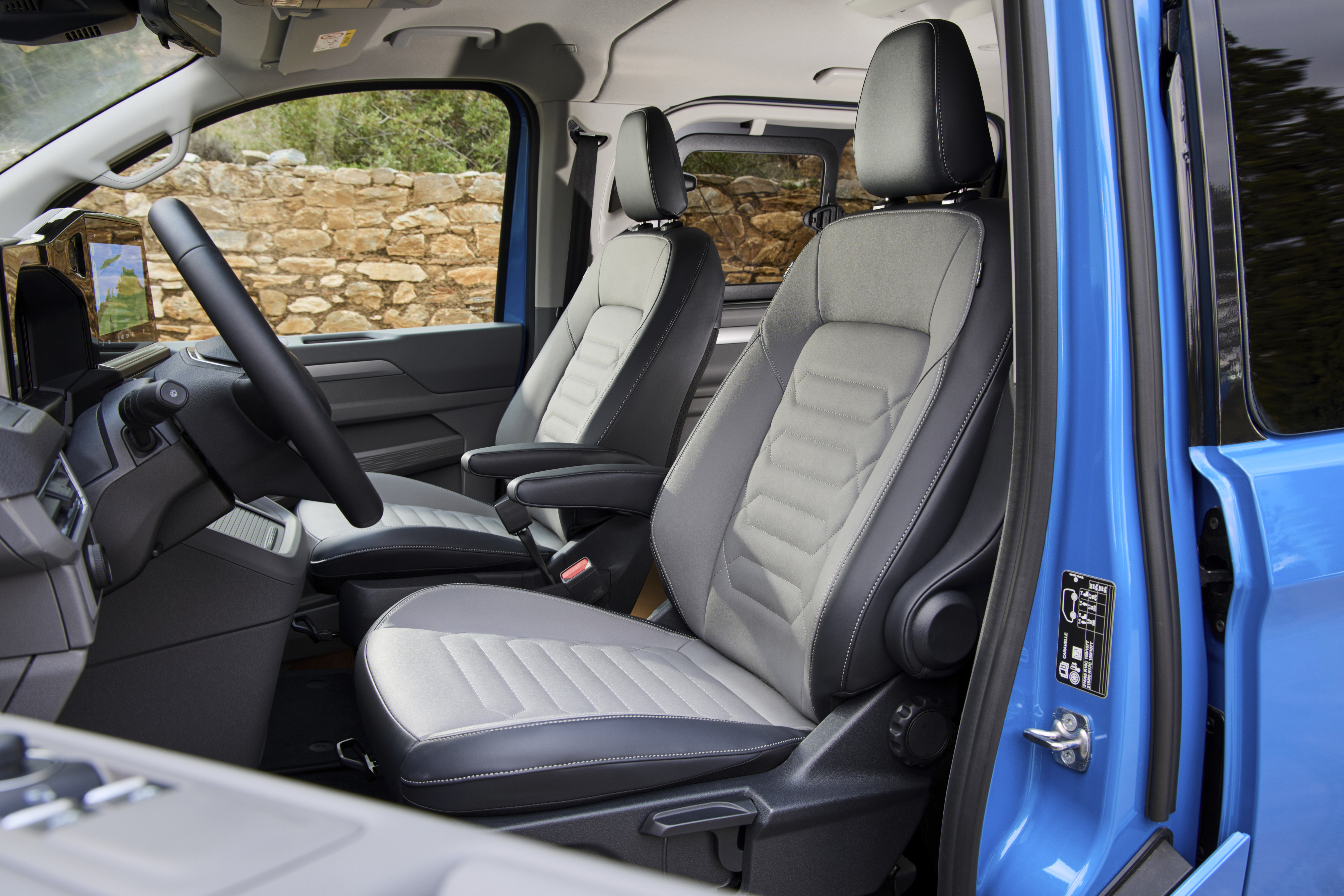 Arbetsplats för proffs: Även interiören och därmed förararbetsplatsen har genomgående anpassats för användning som professionell och flexibel arbetsbil. Alla som äger en T6.1 kommer att känna igen den höga sätespositionen, de breda trösklarna med de lättåtkomliga elfönsterhissarna integrerade upptill och på versioner med manuell växellåda – den höga växelspaken. Till utrustningen för professionella förare hör även ergonomiska stolar för föraren och passageraren fram. Spektrumet sträcker sig från fyrvägssätet som standard i basversionerna till AGR-enkelsäten (tillval) med elektrisk åttavägsinställning (passagerare fram: 6-vägs) och 4-vägs svankstödsinställning. AGR står för ”Aktion Gesunder Rücken” - en oberoende tysk certifiering för beprövade ergonomiska stolar.