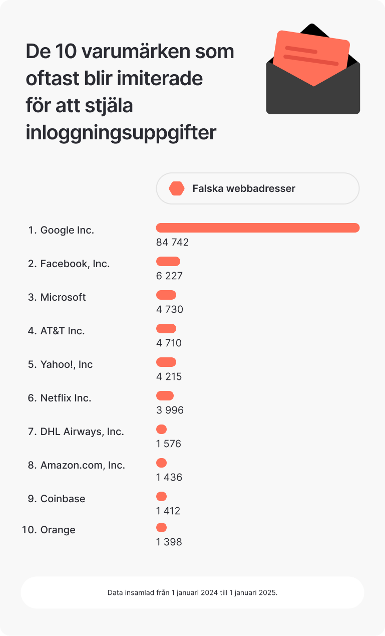 Enligt undersökningen fanns under 2024 cirka 85 000 falska webbplatser som utgav sig för att vara någon av Googles webbplatser och tjänster. Det andra mest populära varumärket bedragare använde sig av var Facebook, med mer än 6 000 falska webbplats. På tredje plats med närmare 5 000 falska webbplatser var Microsoft, och på fjärde Netflix med cirka 4 000.