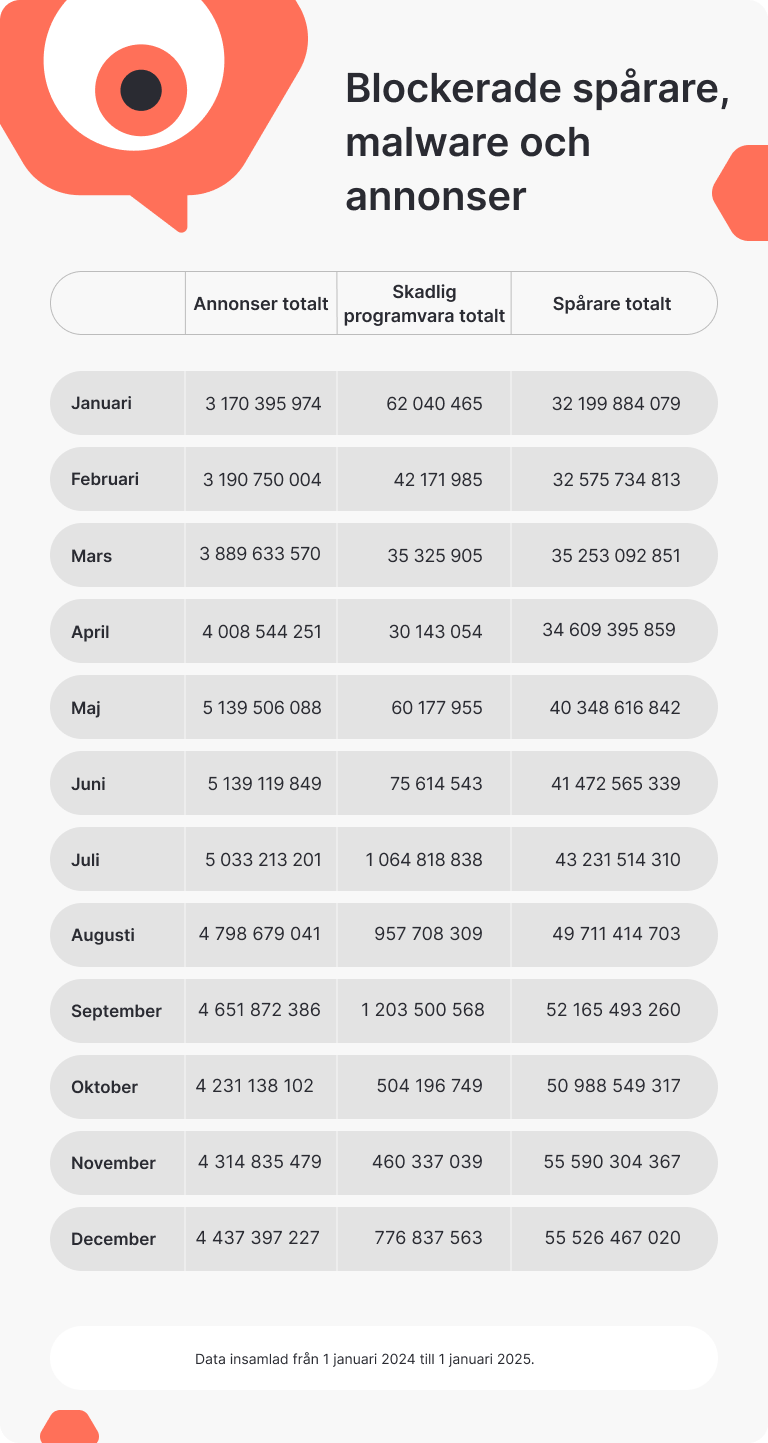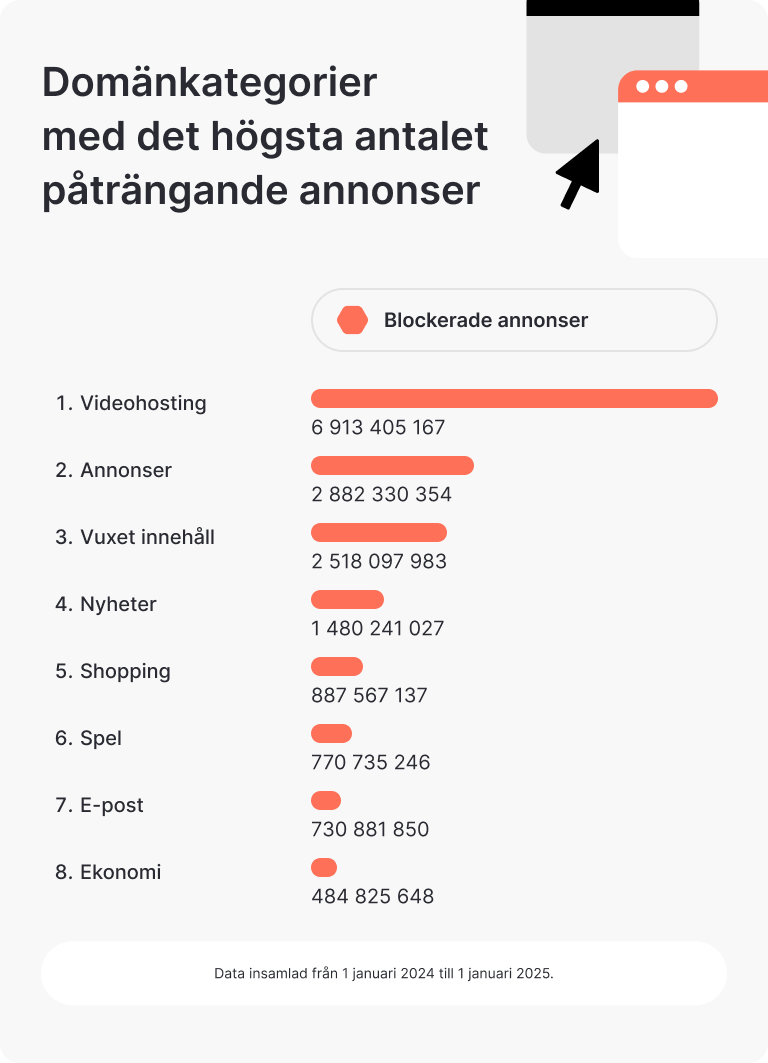“Förutom skadlig kod innehåller falska webbplatser ofta påträngande annonser och spårare. Under 2024 blockerade Threat Protection Pro cirka 7 miljarder annonser och 119 miljarder spårare – och det enbart på sajter för videouppladdning. Detta motsvarar 25 procent av alla spårare som blockerades under året,” säger Adrianus Warmenhoven.