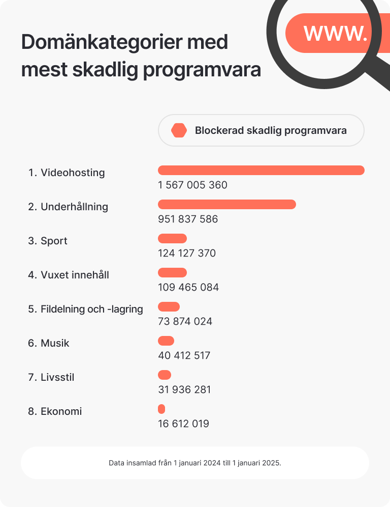 Andra domänkategorier som är viktiga att vara vaksam med än underhållning, där närmare 1 miljard försök att infektera enheter med skadlig kod blockerades 2024, följt av sport med 124 miljoner, sajter med vuxet innehåll (109 miljoner) och fildelning- och lagring med 74 miljoner.