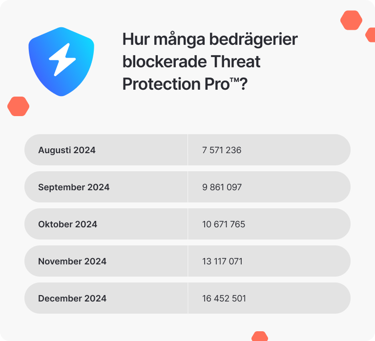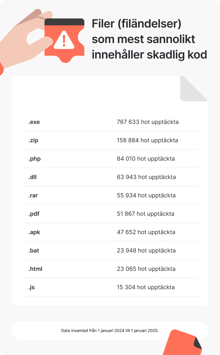 Data som används erhölls genom att analysera aggregerade data som samlats in av NordVPN:s tjänst Threat Protection Pro mellan den 1 januari 2024 och 1 januari 2025. NordVPN stöds inte, underhålls inte av, sponsras inte av, är inte anslutet till eller på något sätt associerat med ägarna till nämnda varumärken. Varumärken anges endast i syfte att korrekt rapportera information kopplat till varumärken, som vanligast imiteras för att sprida skadlig kod.