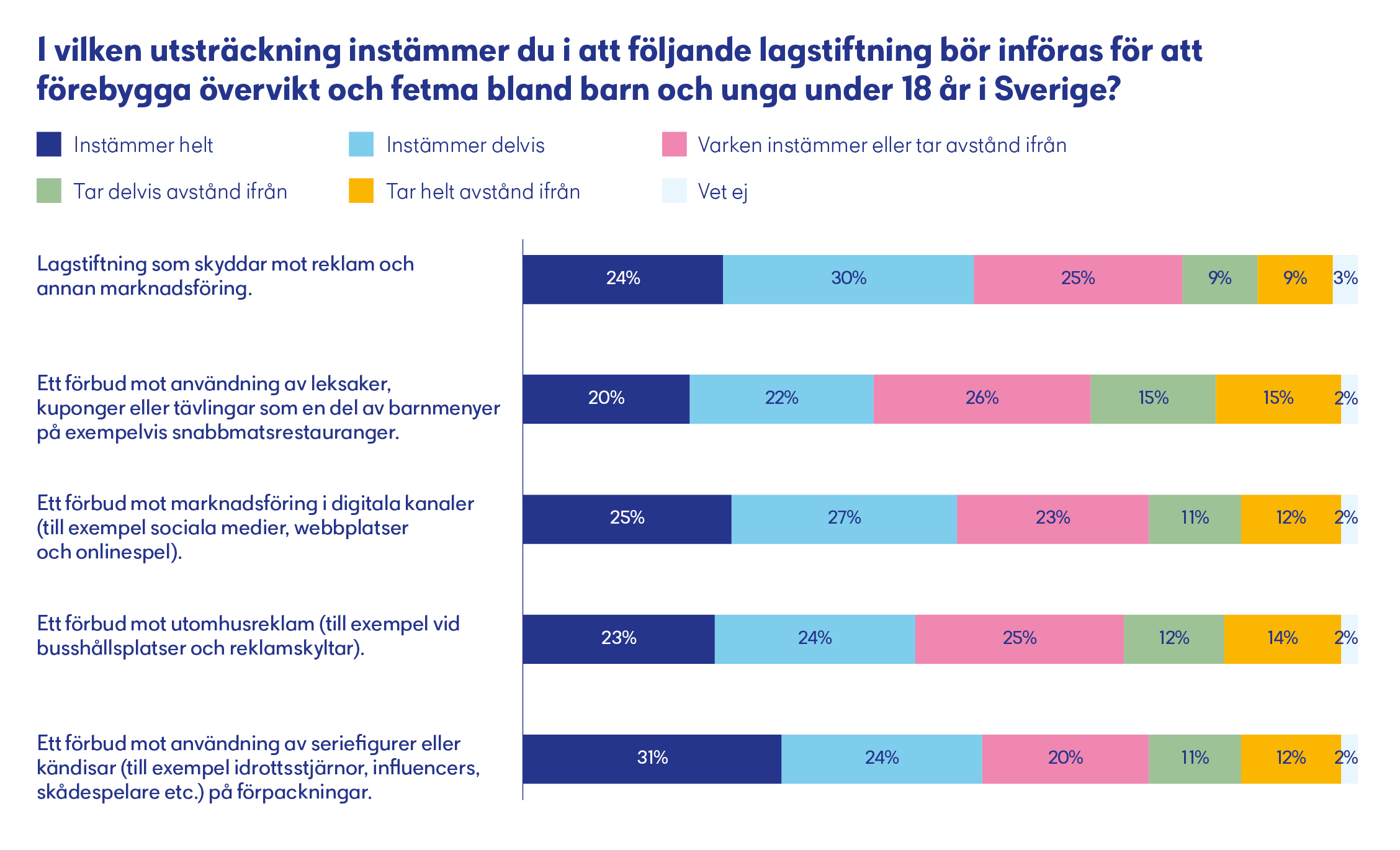 54 procent av de tillfrågade (24 % instämmer helt, 30 % instämmer delvis) stödjer lagstiftning som skyddar mot reklam och annan marknadsföring riktad till barn.