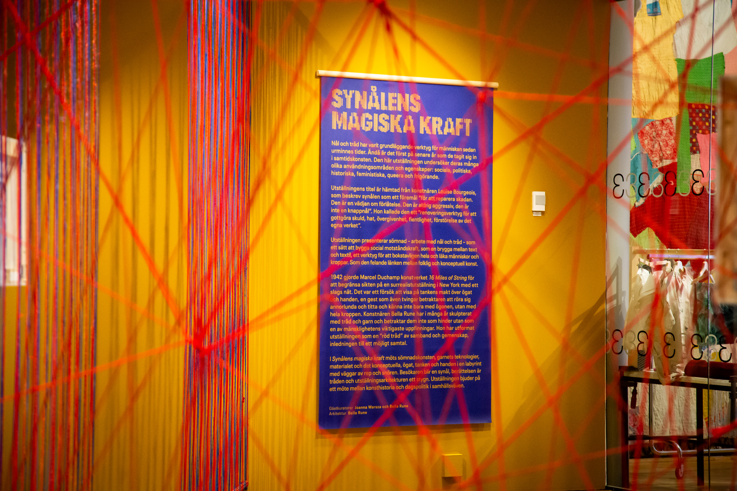 I The Magic Power of the Needle löper tråden genom tid och rum. Utställningen lyfter textila tekniker som historiskt sett förknippats med kvinnor, hantverk och det privata, men som här blir en plattform för politiska, historiska och sociala berättelser. Från handvävda verk som skildrar förlorade berättelser, till broderier som fungerar som aktivistiska budskap, ger utställningen en ny blick på hur textilkonst kan vara både personlig och kollektiv, intim och explosiv. Det äldsta verket i utställningen är ett broderi av Fredrika Eleonora von Düben som levde 1738–1808.