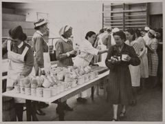 Personal delar ut mat till de kvinnliga flyktingarna i Idrottshallen i Lund. På baksidan står det skrivet med bläck "Lund maj 1945 Aurella har tagit för sig". Foto EW Fischer, ur Kulturens samlingar. Om du lyssnar på berättelsen "Panik utbryter vid Badhuset våren 1945" i vandringsspåret "I de överlevandes spår" får du höra om flyktingars upplevelser vid ankomsten till Lund.