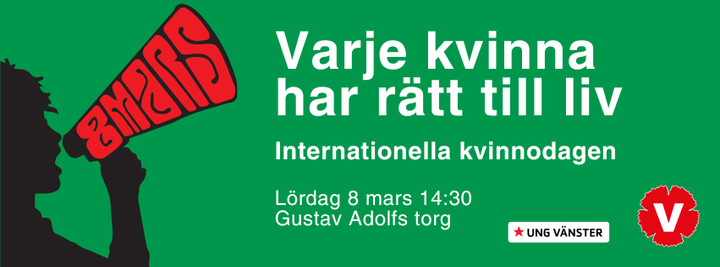 Under årets 8 mars uppmärksammar Vänsterpartiet Malmö och Ung vänster alla kvinnor som varit offer och fortsätter att vara offer för förtryck, krig och våld. Det är med en internationalistisk anda som vi uppmanar Malmöborna att gå ut på gatorna den 8 mars under parollen “Varje kvinna har rätt till liv”. Alla människor har rätt till ett liv värt att leva. Och varje kvinna har rätt till liv.