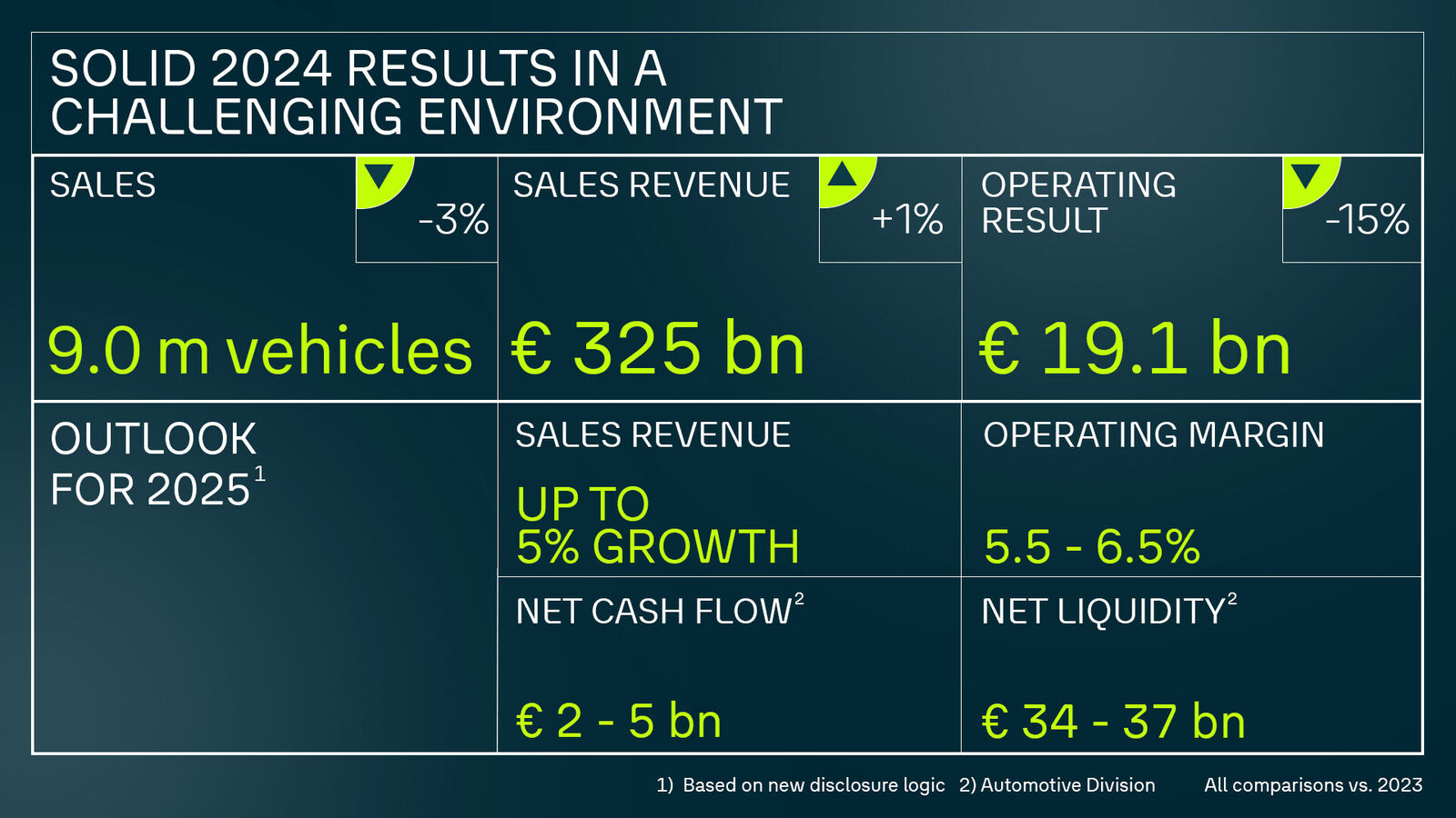 Rörelseresultatet uppgick till 19,1 miljarder euro för 2024, vilket var 15 procent lägre än 2023 (22,5 miljarder euro). Försäljningsmarginalen uppgick till 5,9 procent. Minskningen av rörelseresultatet drevs av en betydande ökning av de fasta kostnaderna, inklusive extraordinära kostnader på totalt 2,6 miljarder euro netto, särskilt för omstrukturering.