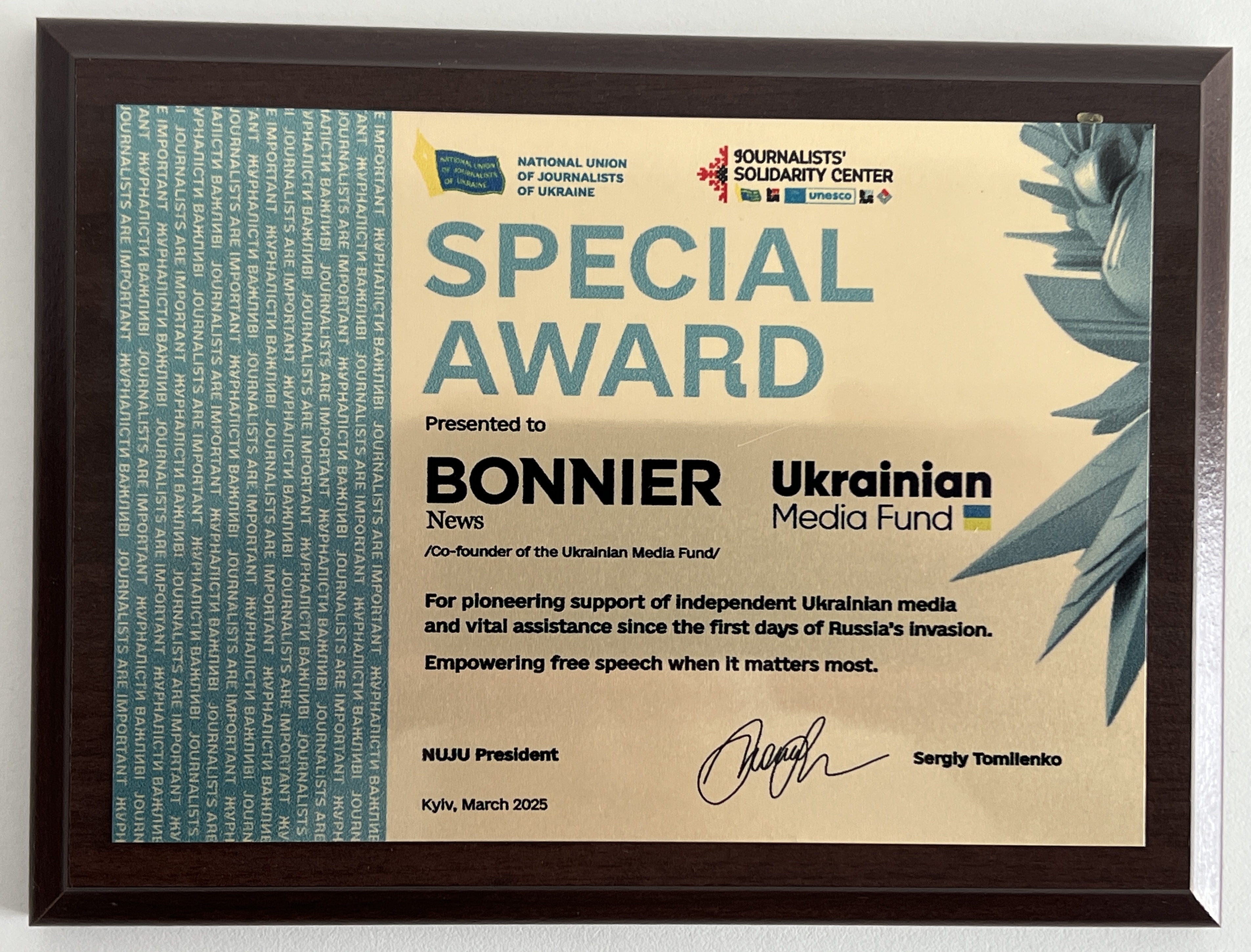 Nu har Ukrainas journalistförbund tackat Anders Eriksson, vd för Bonnier News och ordförande för Tidningsutgivarna som är medgrundare till nordiska Ukrainian Media Fund. Motiveringen lyder: