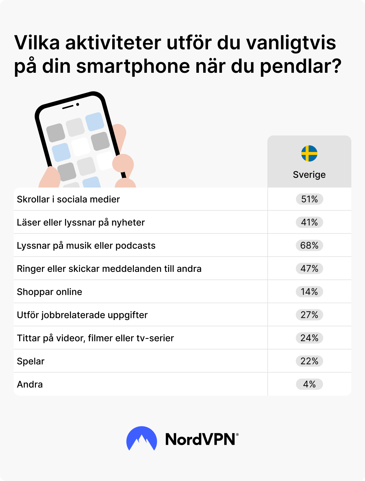 NordVPN, den 25 april, 2025 – NordVPN, ett cybersäkerhetsföretag, publicerar en ny undersökning om svenskars användning av elektronik när de pendlar. Av de 1 000 svenskar som tillfrågats svarade 65 procent att de surfar på internet under pendlingstiden. Av dessa är det 7 av 10 (68%) som lyssnar på musik eller en podcast, 51 procent som skrollar genom sociala medier och 47 procent som ringer eller skickar meddelanden.