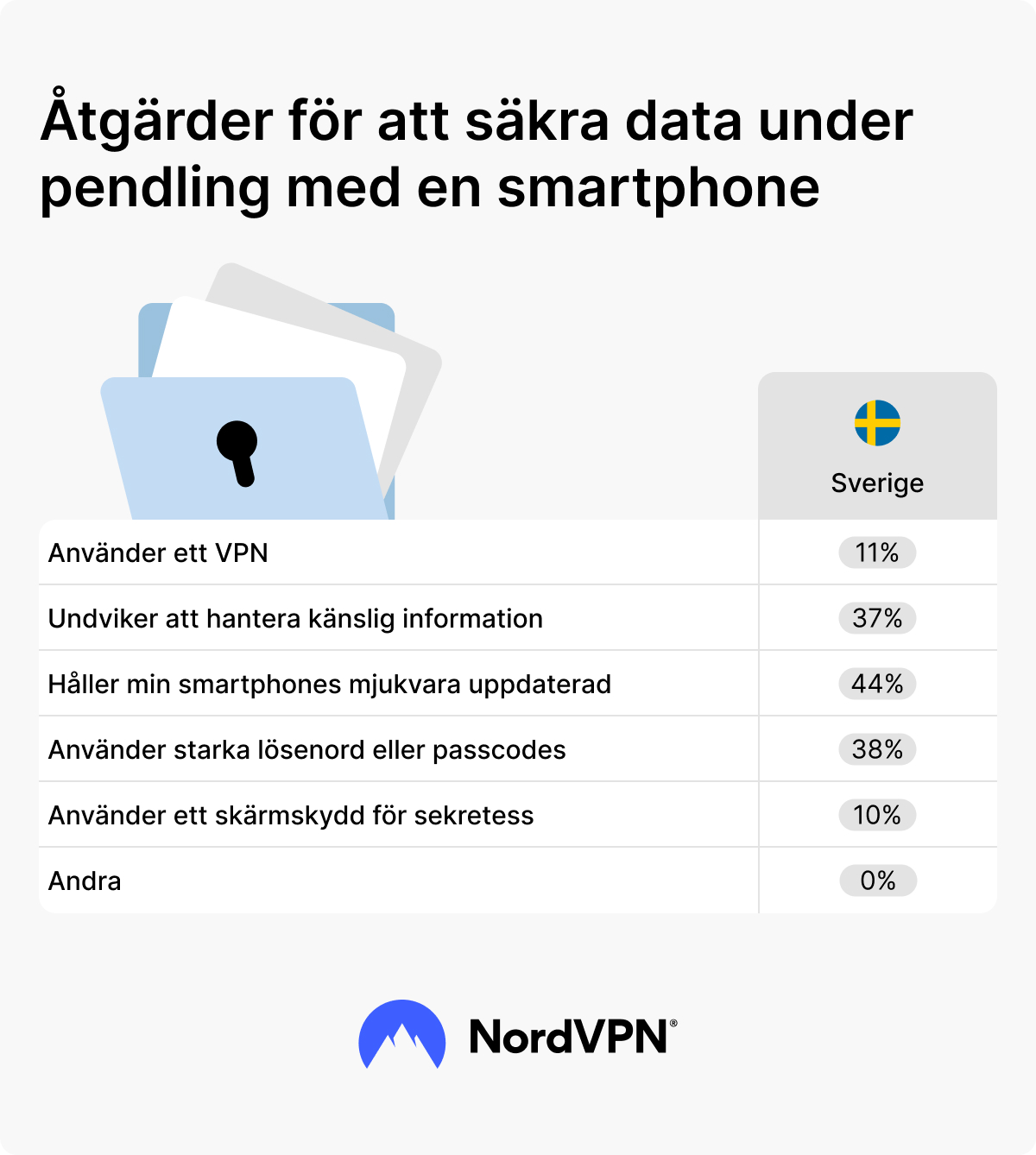 Totalt 72 procent anger att de vidtar åtminstone en åtgärd för att skydda sin integritet och data när de pendlar – 37 procent undviker att komma åt känslig information och 10 procent använder sig av ett skärmskydd med sekretessfilter, som med hjälp av ljuspolarisering gör att det inte går att se skärmens innehåll annat än rakt framifrån. Sett till andra åtgärder som bör vidtas i alla lägen svarade 44 procent att de alltid håller sin mjukvara uppdaterad och 38 procent att de använder starka lösenord.