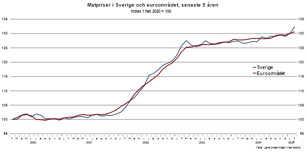 Siffror för matpriser avser kategorin ”livsmedel och alkoholfria drycker” ur konsumentprisindex i Sverige (SCB) och euroområdet (Eurostat). För internationella livsmedelspriser har FAO:s World Food Price Index använts. Statistiken bygger på siffror till och med februari 2025. Femårsperioden som åsyftas avser mars 2020 – februari 2025. Källa: SCB, Eurostat, FAO, Macrobond och Länsförsäkringar.