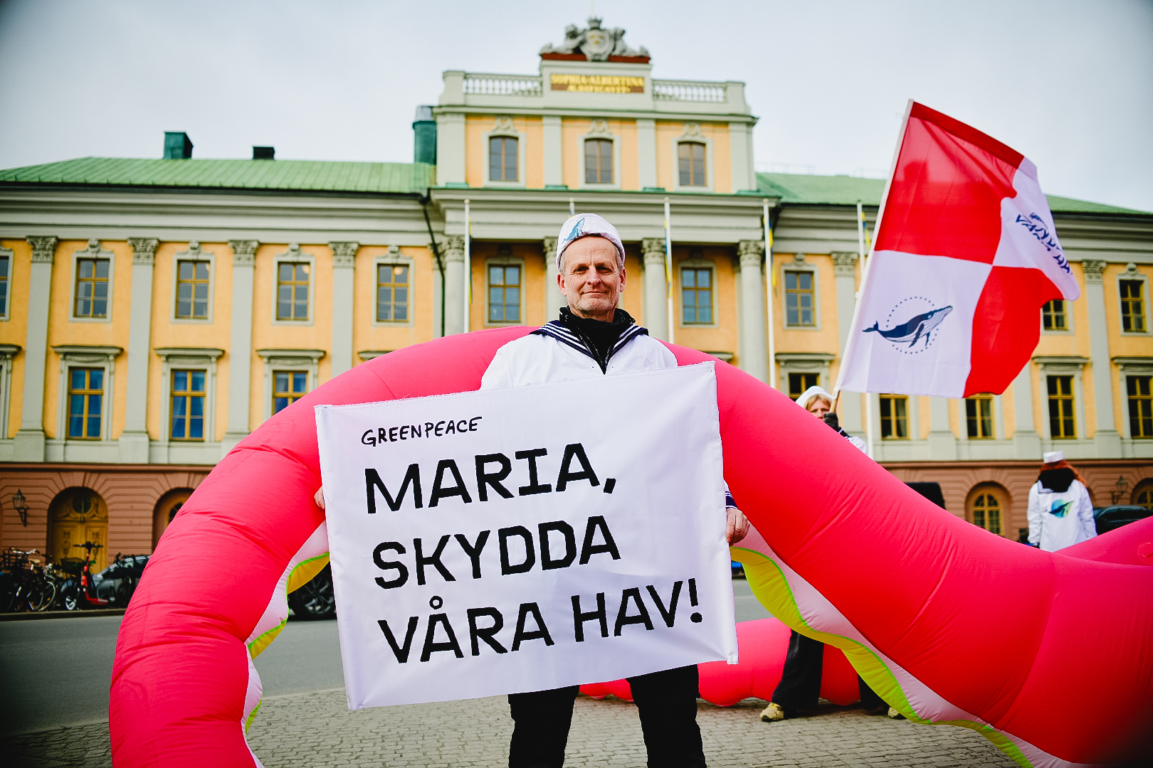 Stockholm – Idag möttes utrikesdepartementets personal av aktivister utklädda till sjömän och en 6 meter hög rosa bläckfisk, med en gigantisk penna, som uppmanade utrikesminister Maria Malmer Stenergard att sätta bläck på ratificeringen av det globala havsavtalet. Under måndagen överlämnas nämligen en efterlängtad utredning till utrikesministern om hur FN:s globala havsavtal (BBNJ) kan integreras i svensk lagstiftning. Men Sveriges agerande härifrån riskerar att fördröja skyddet av haven.