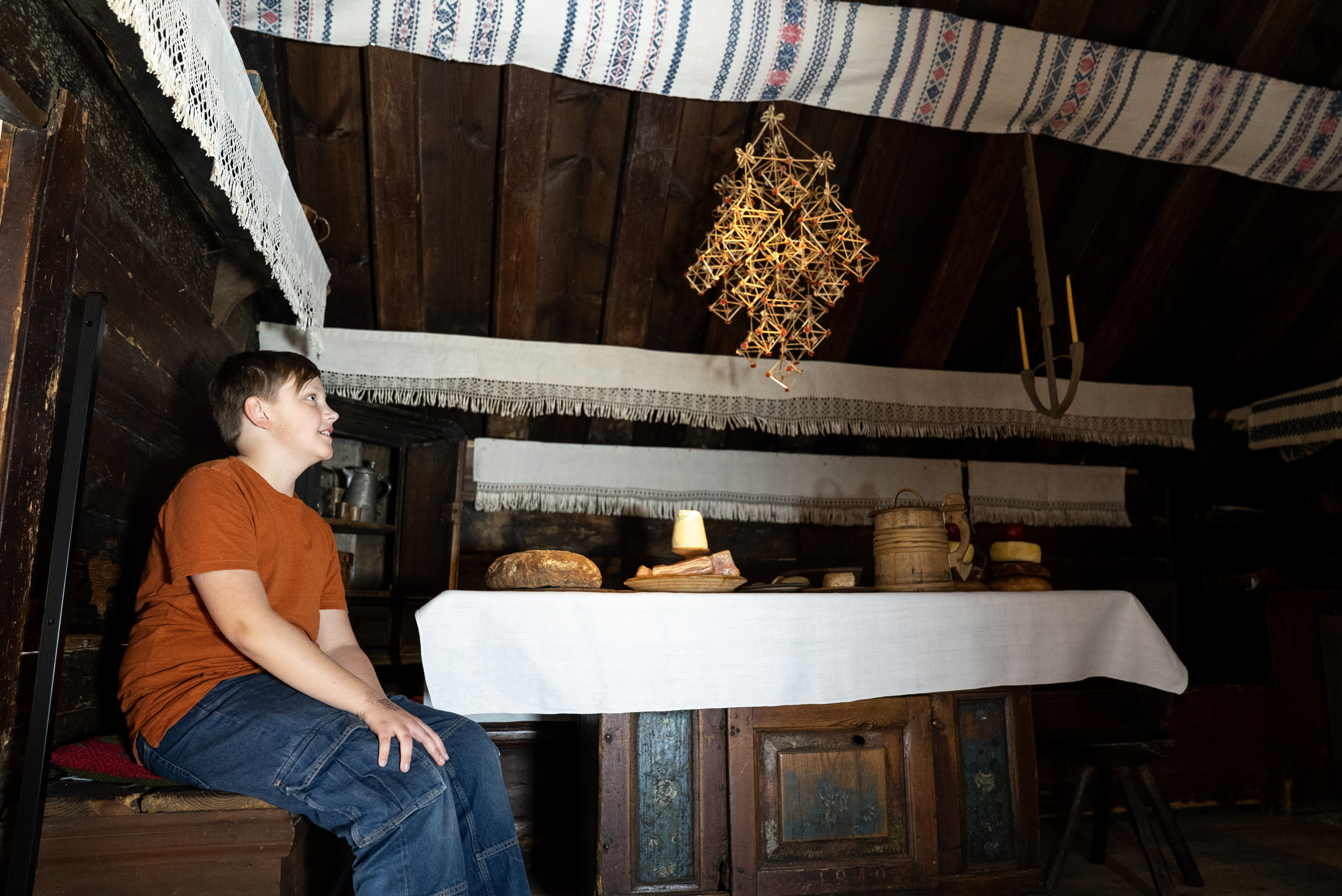 På ovanvåningen i Allmogehallen har riktiga hus och möbler flyttats in för att återskapa det dagliga rummet – vardagsrummet, med dagens ord – där människor en gång vistades, lagade mat och sov.