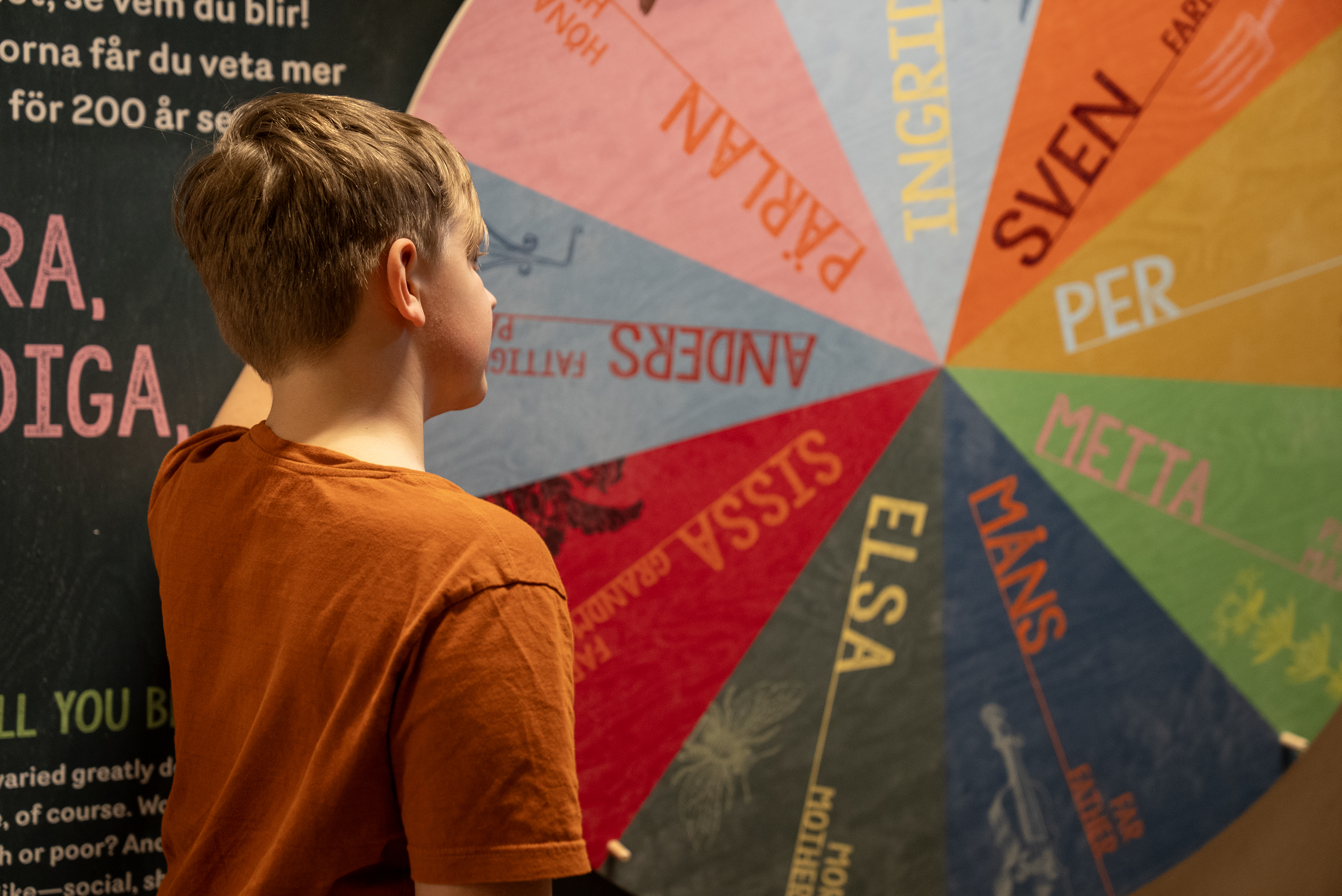 Det första besökaren möts av i utställningen är ett stort hjul med olika roller. När man snurrar på hjulet så får man en karaktär från allmogetiden; mor, far, farmor, piga, dräng, fattighjon, 4-årig flicka, 8-årig pojke - eller en höna.